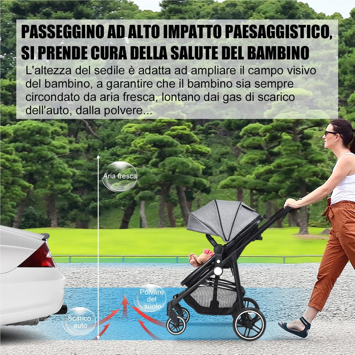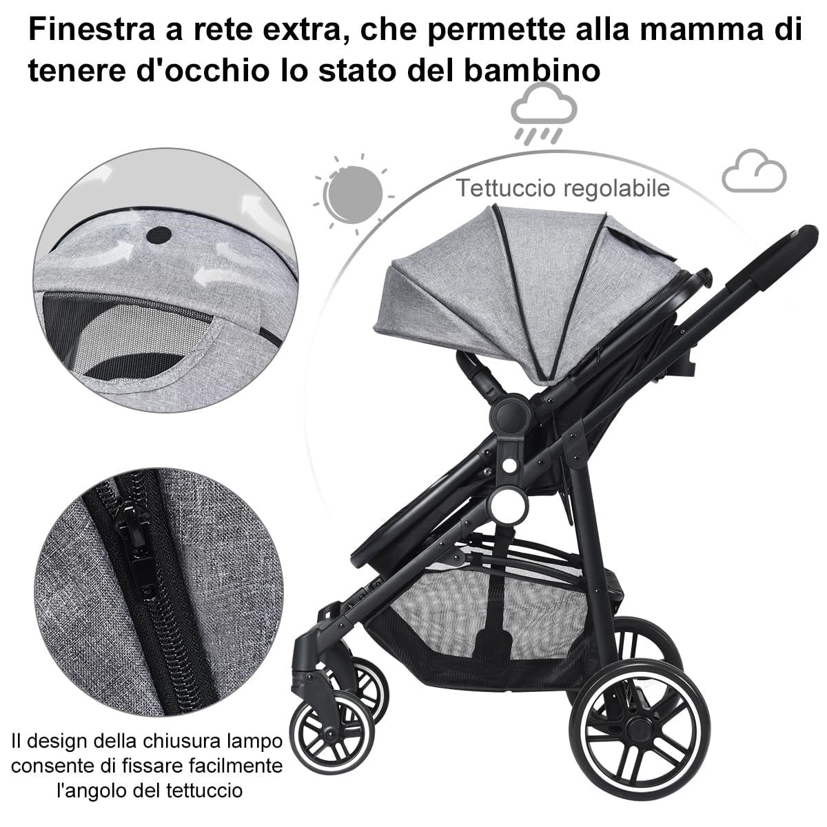 2 in 1 Passeggino per Bambini, Passeggino Pieghevole con Sedile Reversibile, Schienale Regolabile, Passeggino Leggero con Cintura di Sicurezza, Copertura, per Bambini 0-3 Anni Grigio