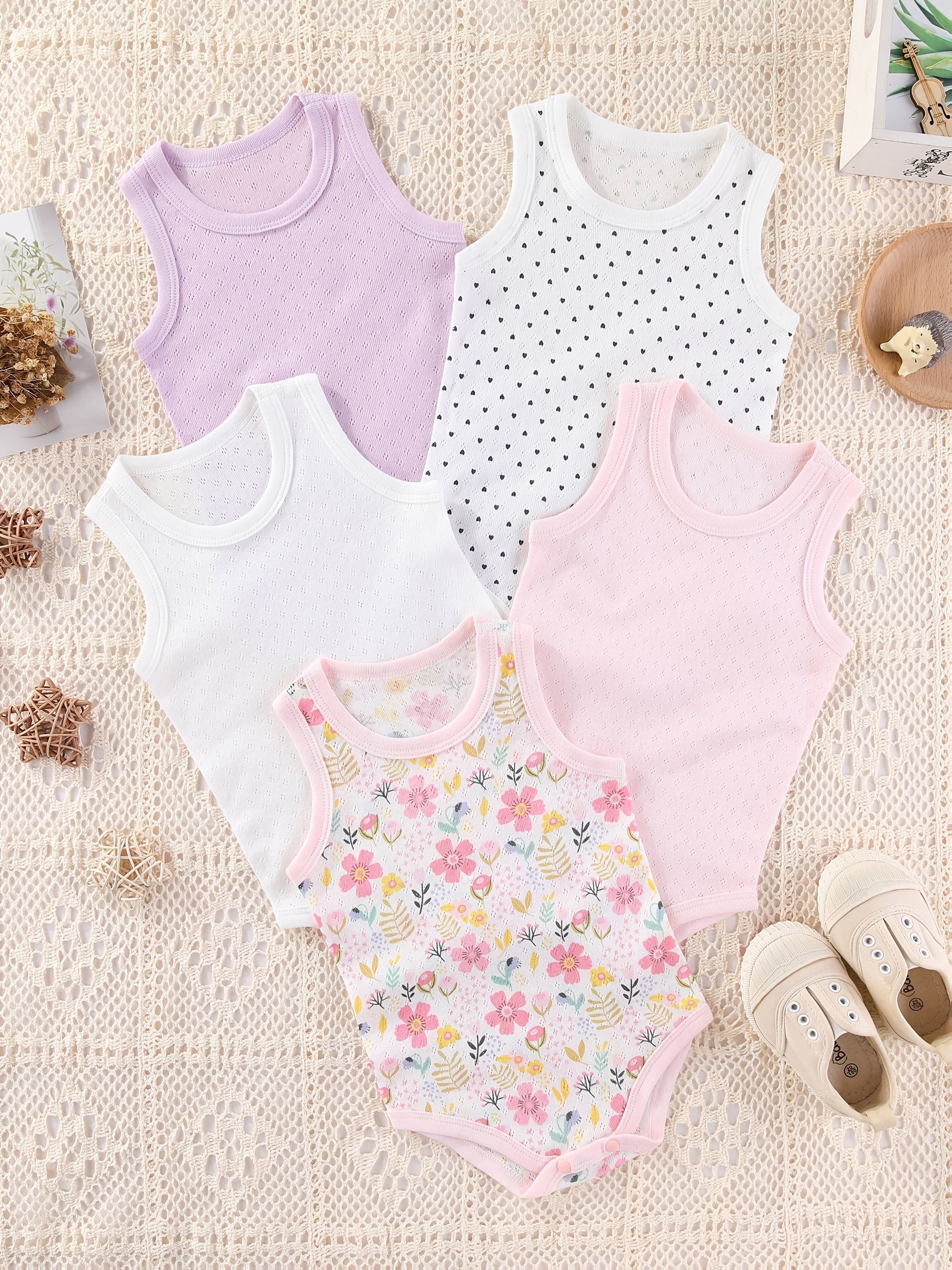 5pcs Tutina in Puro Cotone con Stampa Integrale per Bambine 0-24m, Perfetta per l'Esterno
