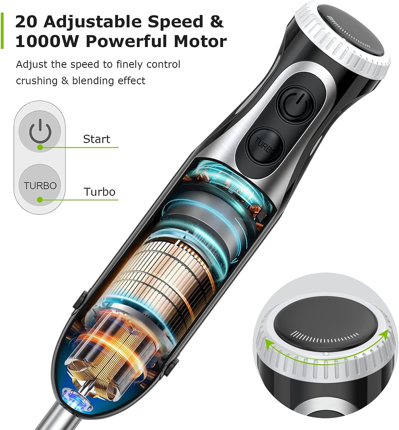 Bonsenkitchen Frullatore a Immersione Multifunzione 4 in 1, Minipimer in Acciaio Inox, 1000 W, 20 Velocità Regolabili, con Frusta, Tritatutto da 500 ml e Misurino da 700 ml, HB3203