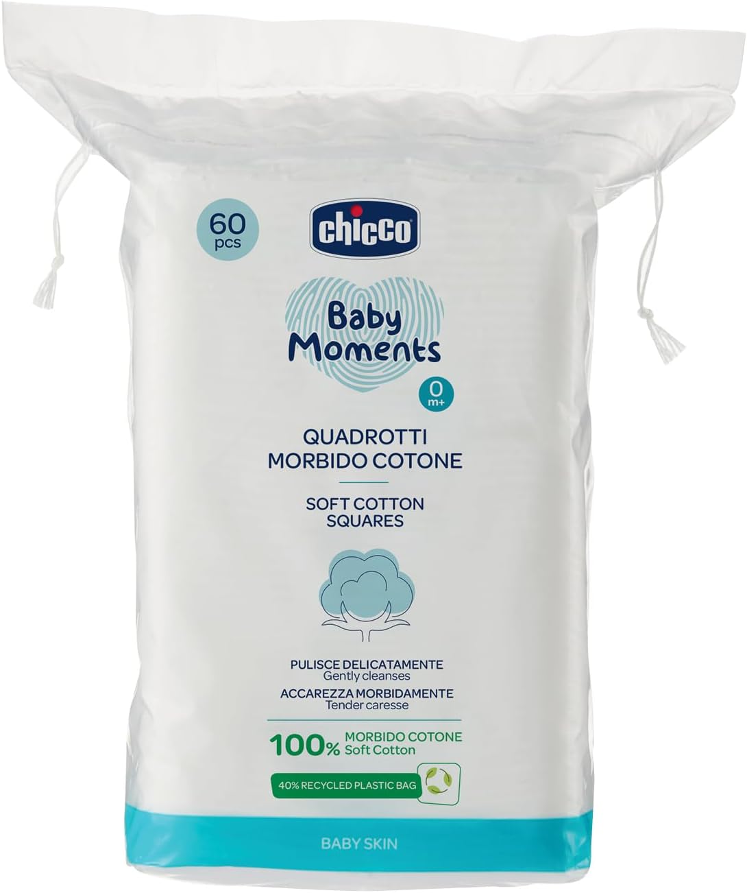 Chicco Baby Moments Quadrotti Morbido Cotone, Pulisce Delicatamente e Accarezza Morbidamente, Baby Skin, Bianco, 60 Pezzi, 0+ Mesi