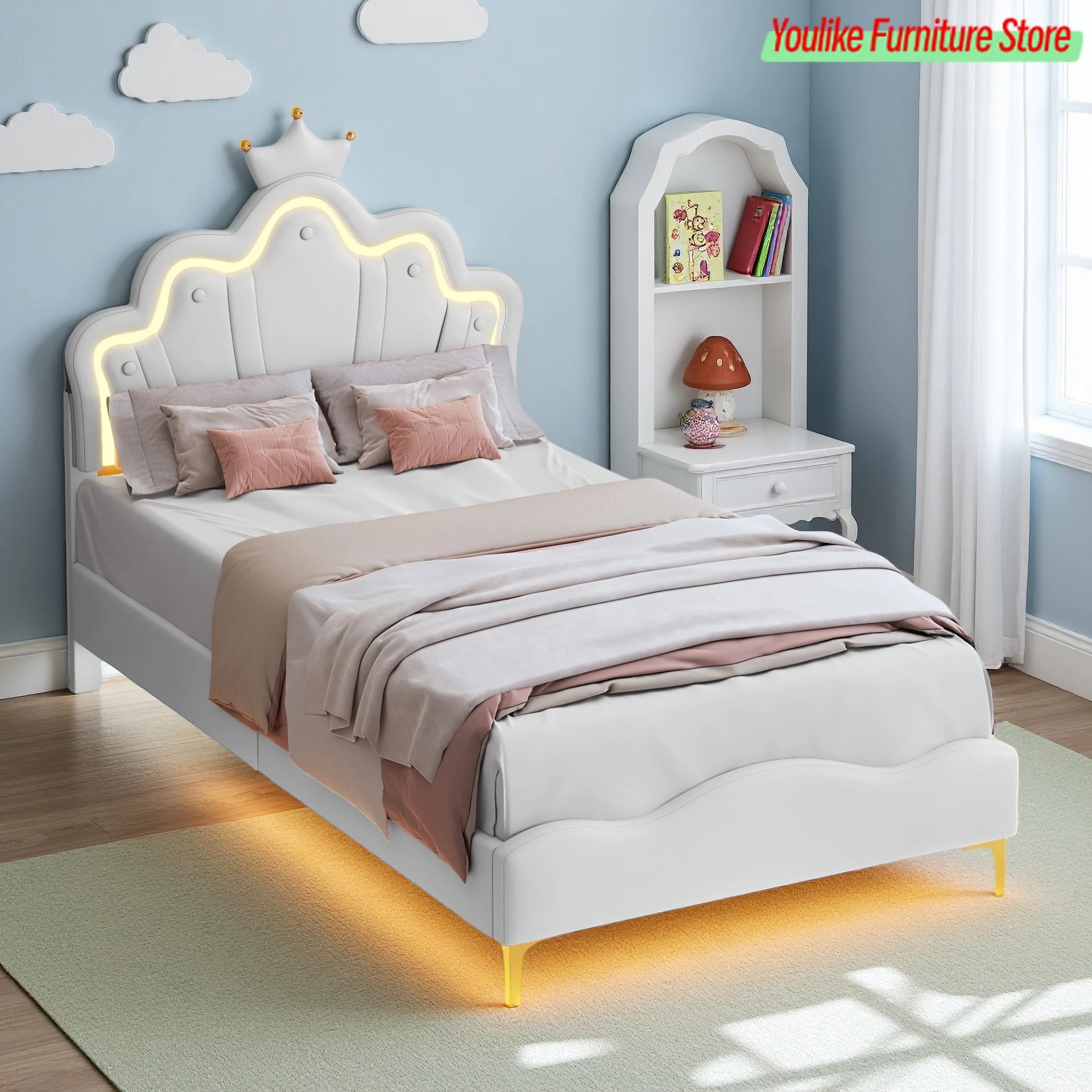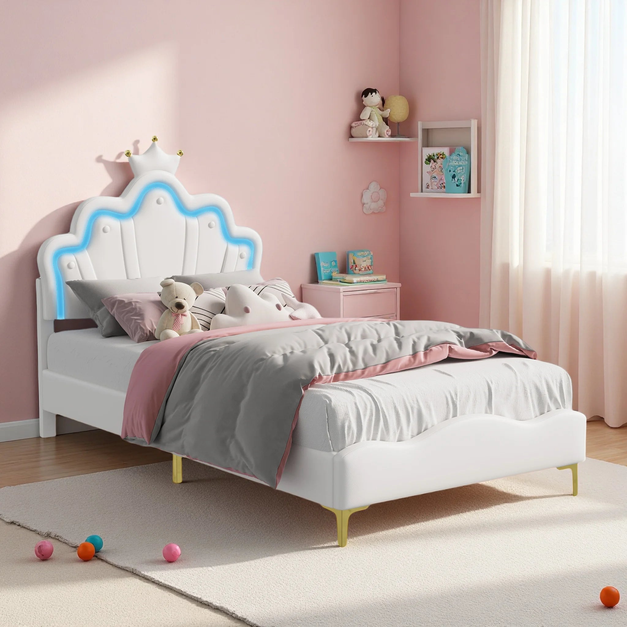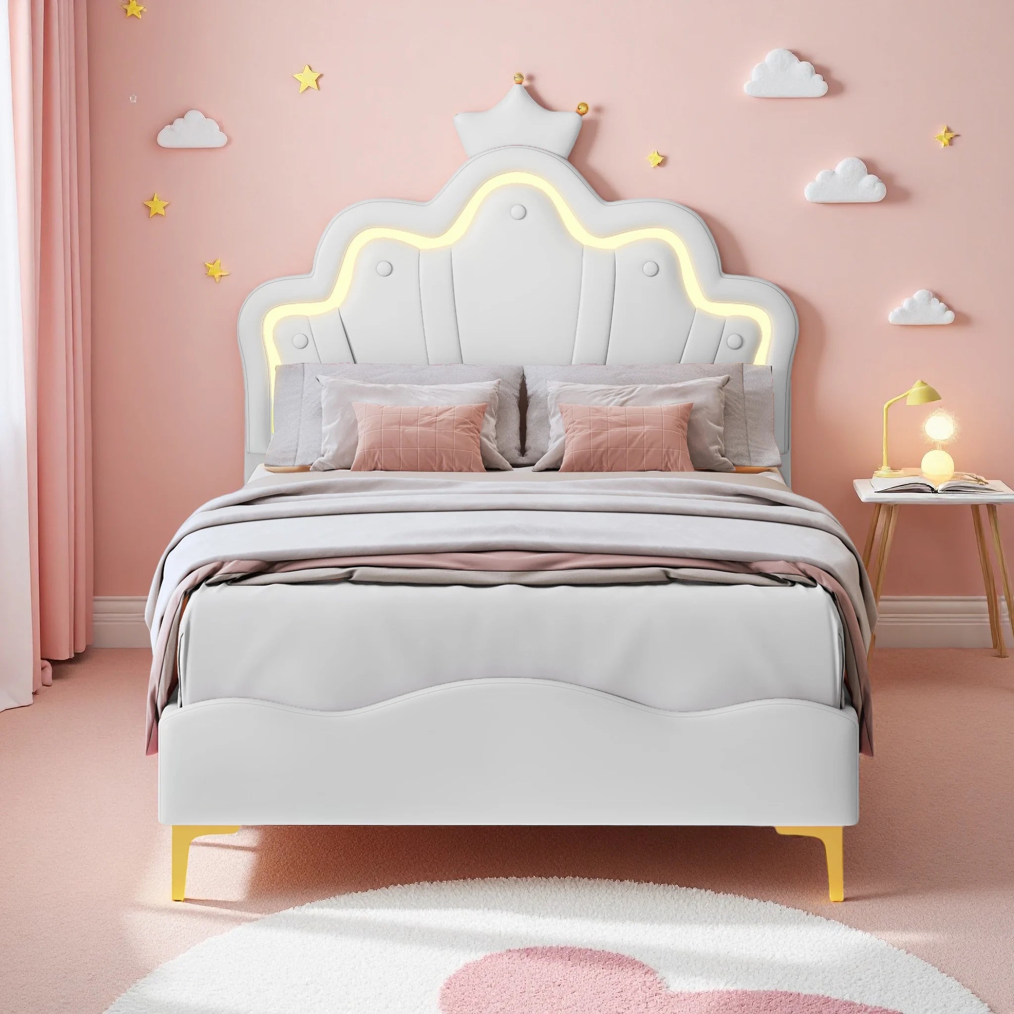 Comanlai Letto per bambini 90x200 cm con luce LED e testiera a forma di corona, letto imbottito con rete a doghe, pelle PU, bianco