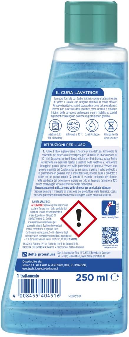 Dimensioni prodotto:20 x 7,6 x 2,4 cm; 250 grammiNome del prodotto:Cura LavatricePeso:250 GrammiUnità:250.0 MillilitriContatto produttore:delta pronatura Kurt-Schumacher-Ring 15-17 63329 Egelsbach... Per saperne di più