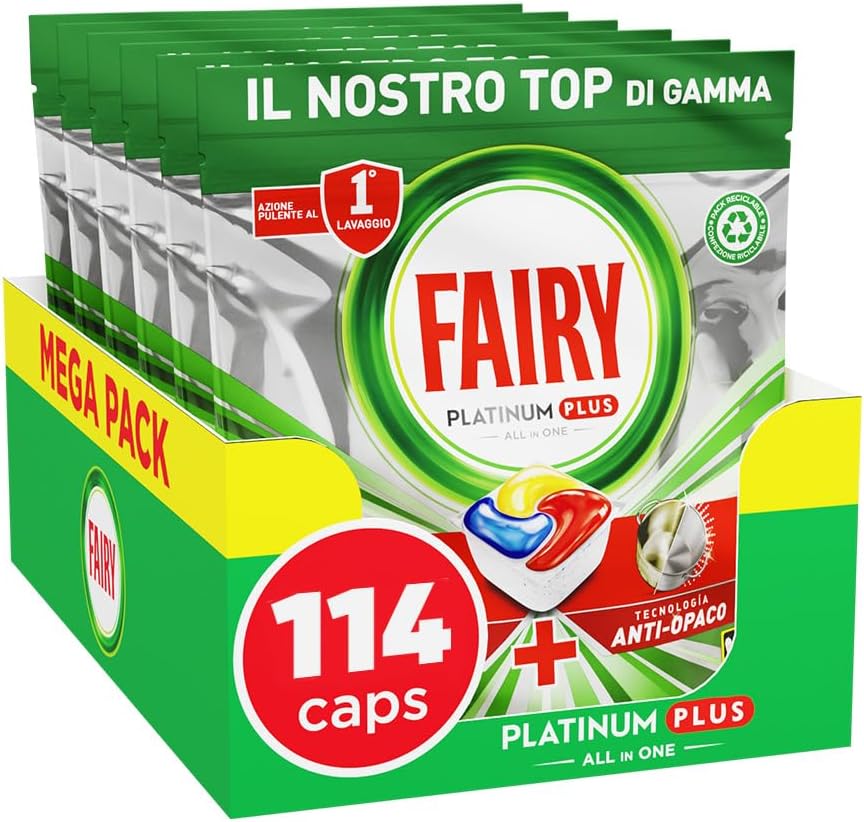 Fairy Platinum Plus Pastiglie Lavastoviglie, 114 Capsule, Limone, Detersivo Con Tecnologia Anti-Opaco, Contro Grasso e Incrostazioni Ostinate Anche nei Cicli Brevi