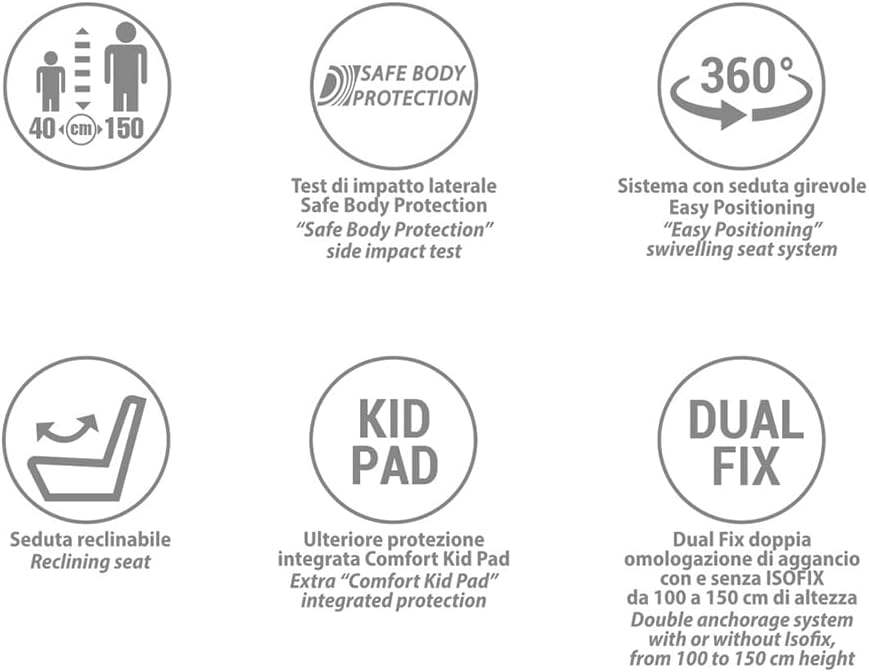 Foppapedretti Seggiolino Auto Circle I-Size, Seduta Girevole a 360°, per bambini da 40 a 150 cm di altezza, 0-12 anni, conforme ECE R129, Fissaggio Isofix e TopTether, Safe Body Protection, Silver