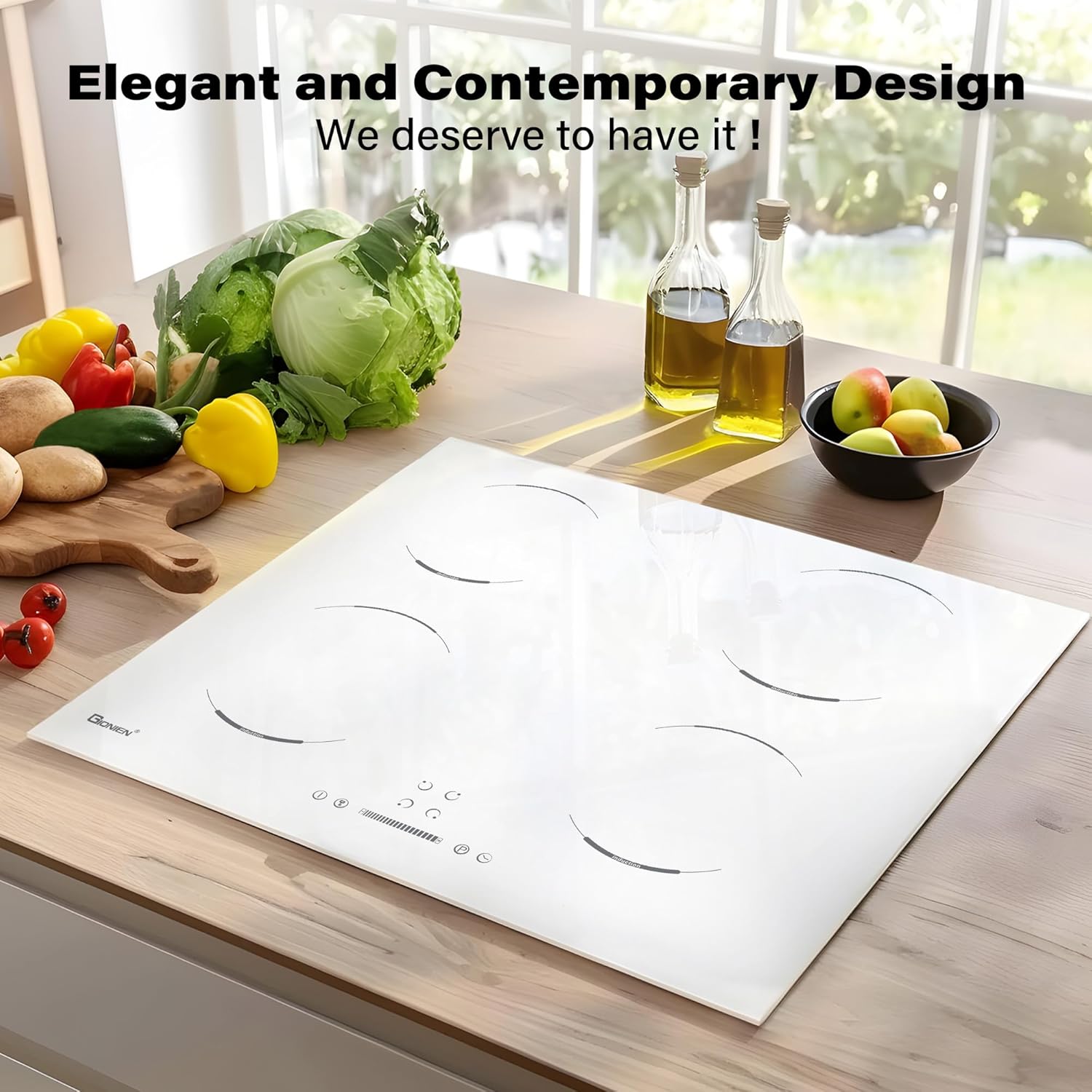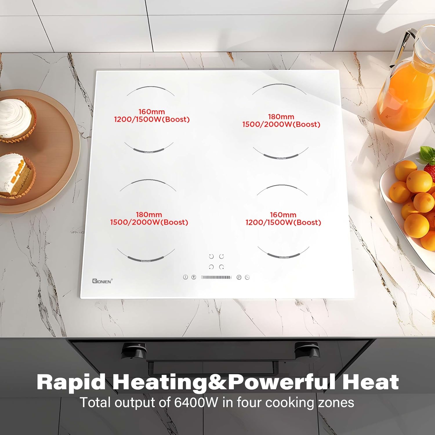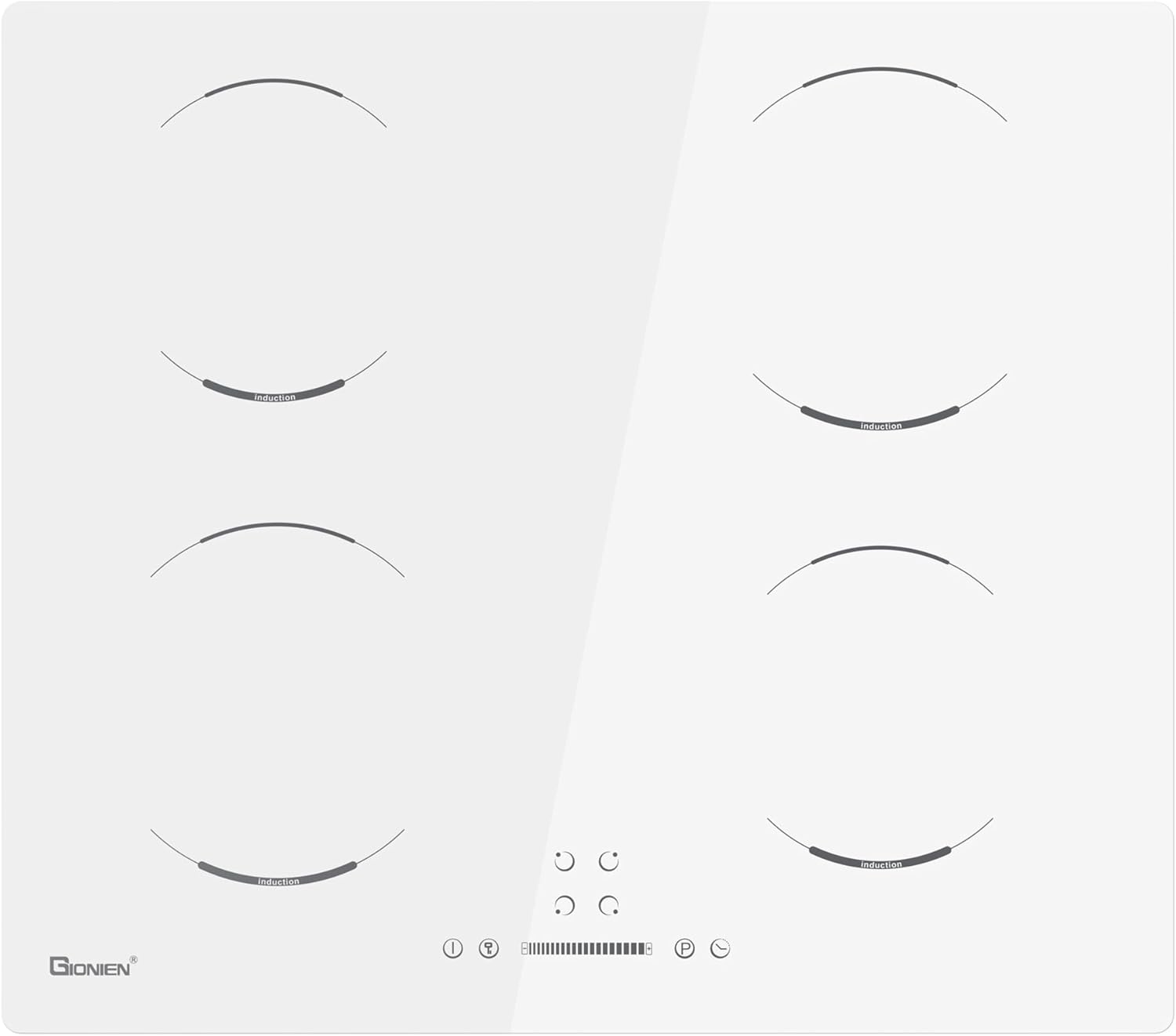 GIONIEN Piano cottura a induzione 60cm, 4 fuochi elettrici, fornello a 4 zone, blocco bambini, vetro ceramico bianco, piano di lavoro da incasso, timer, spegnimento automatico, 6400W