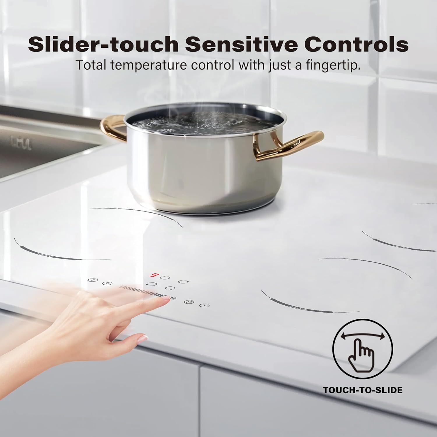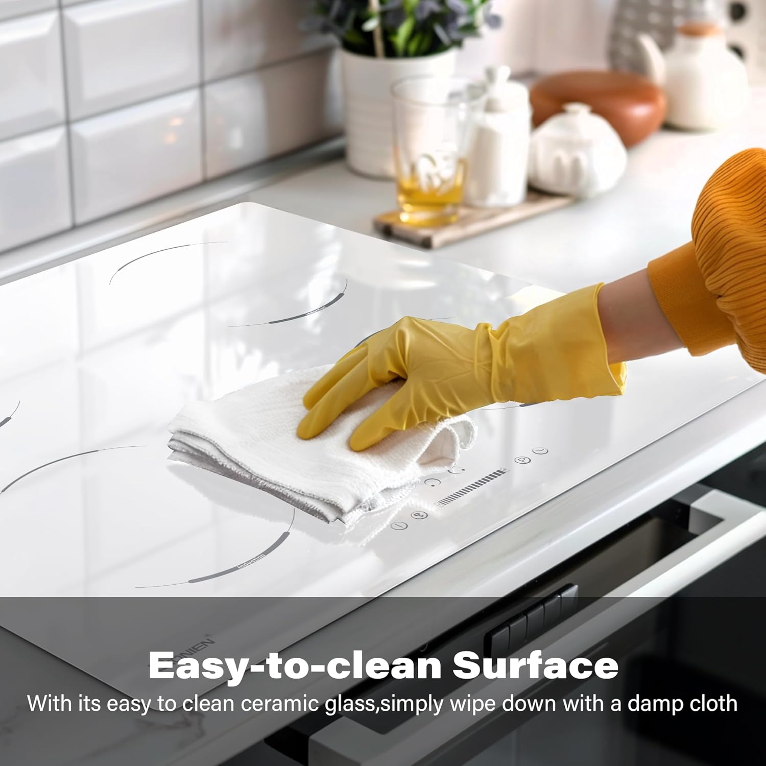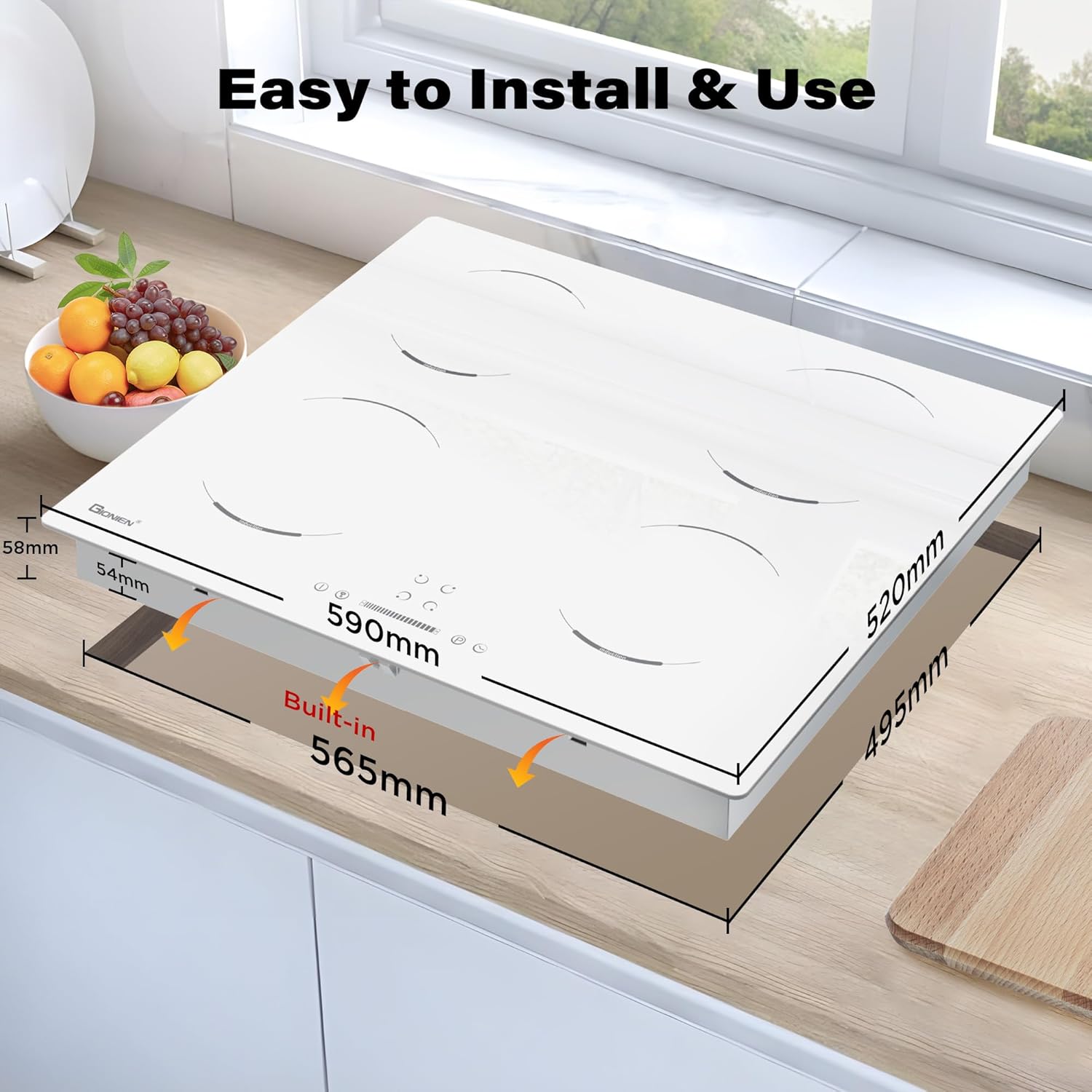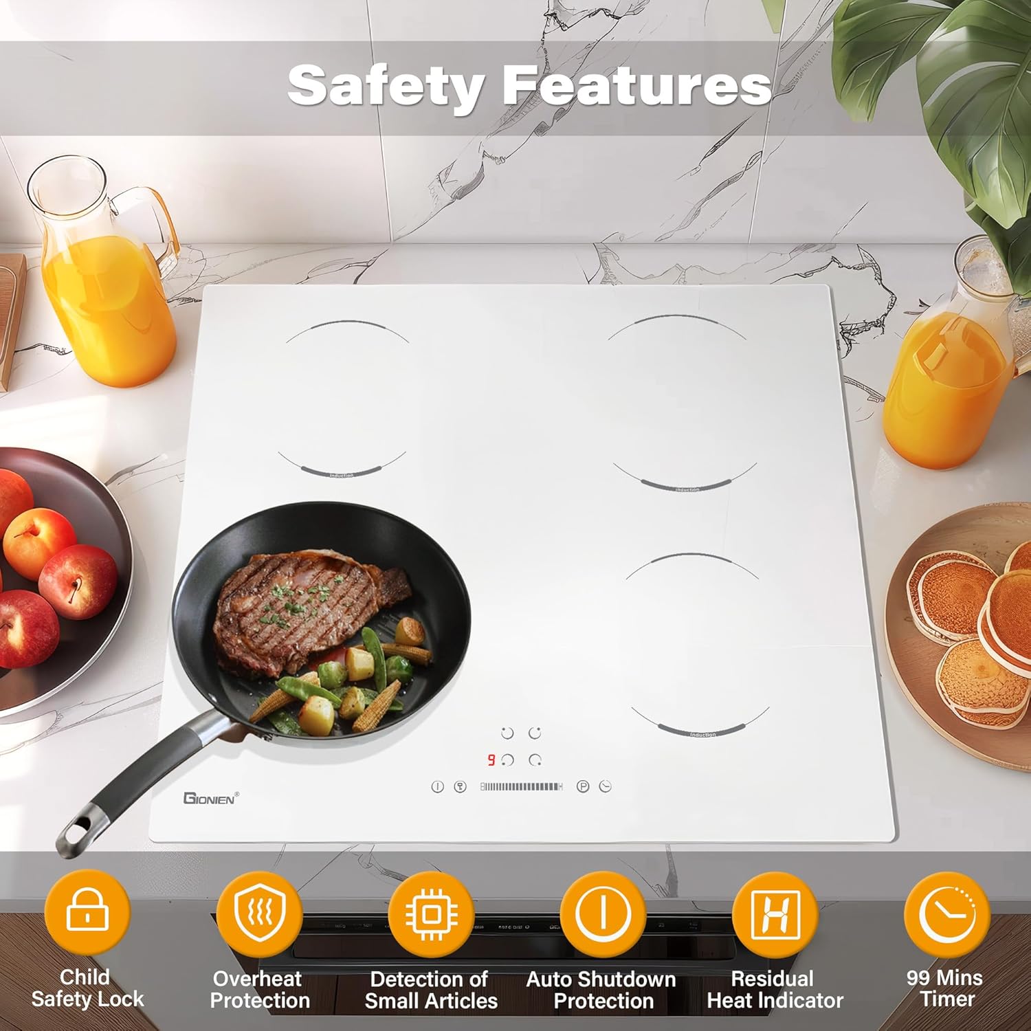 GIONIEN Piano cottura a induzione 60cm, 4 fuochi elettrici, fornello a 4 zone, blocco bambini, vetro ceramico bianco, piano di lavoro da incasso, timer, spegnimento automatico, 6400W