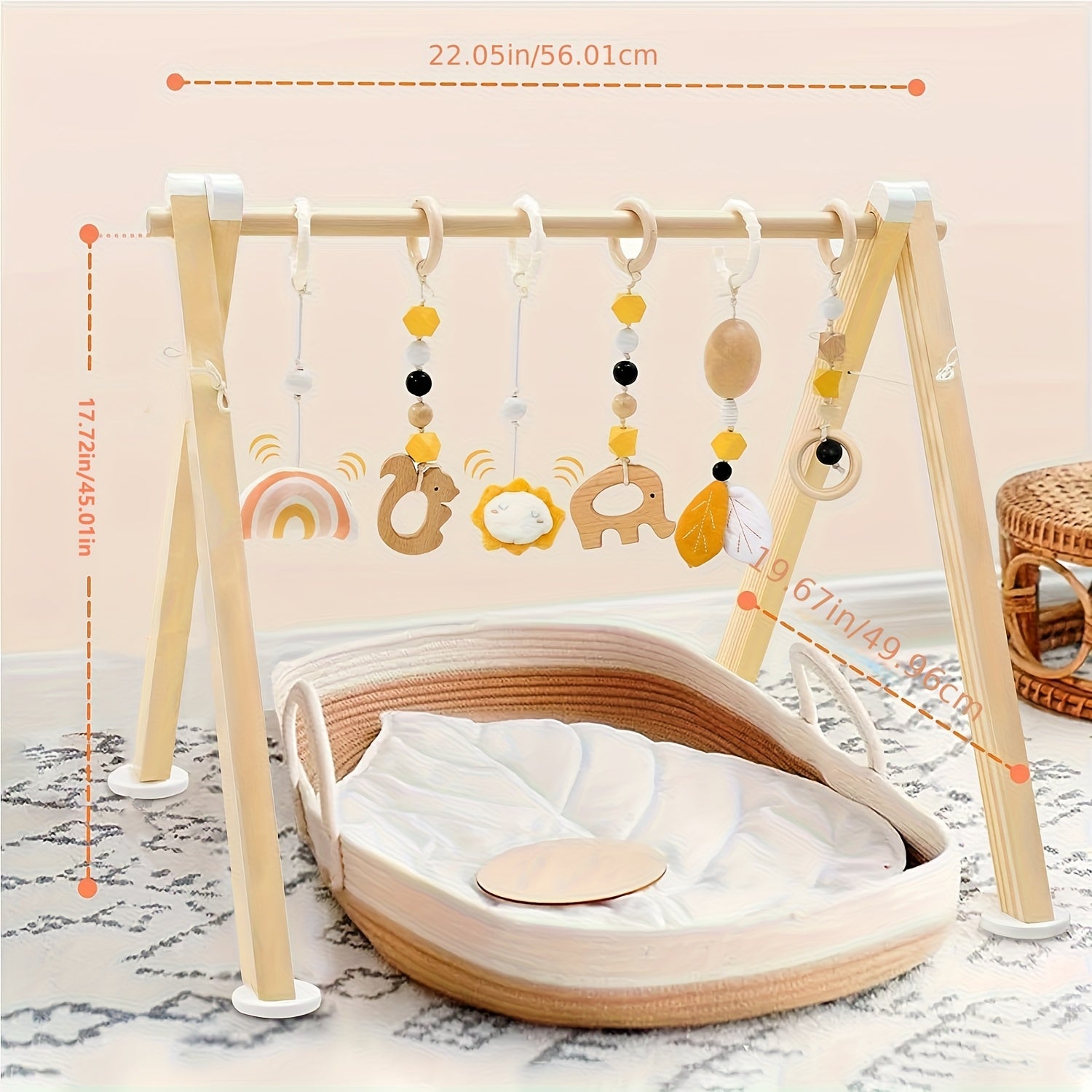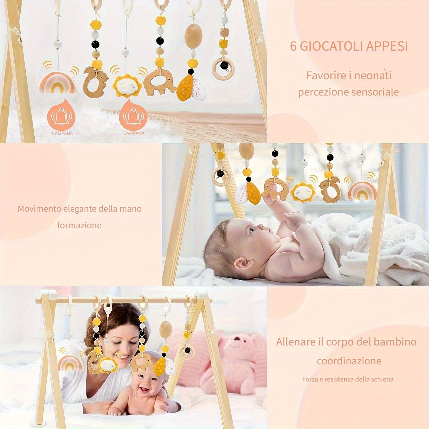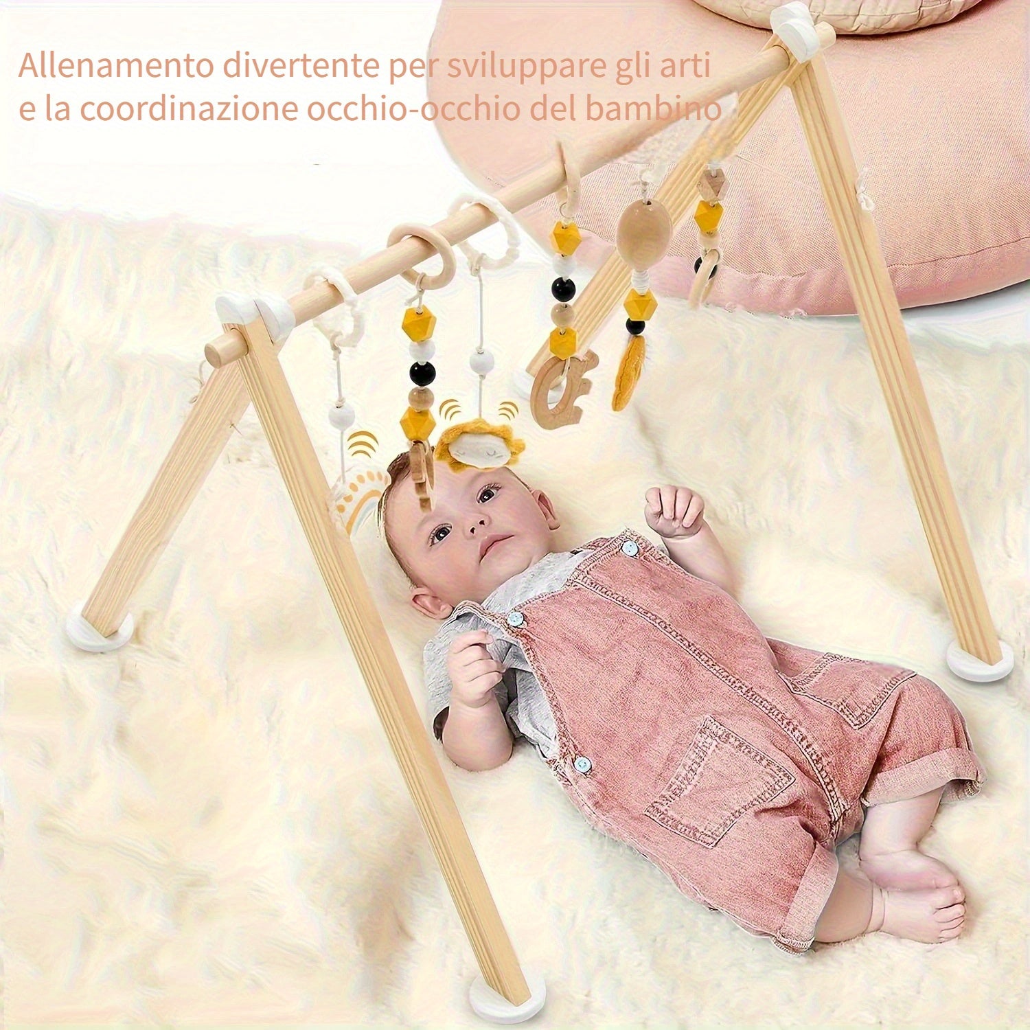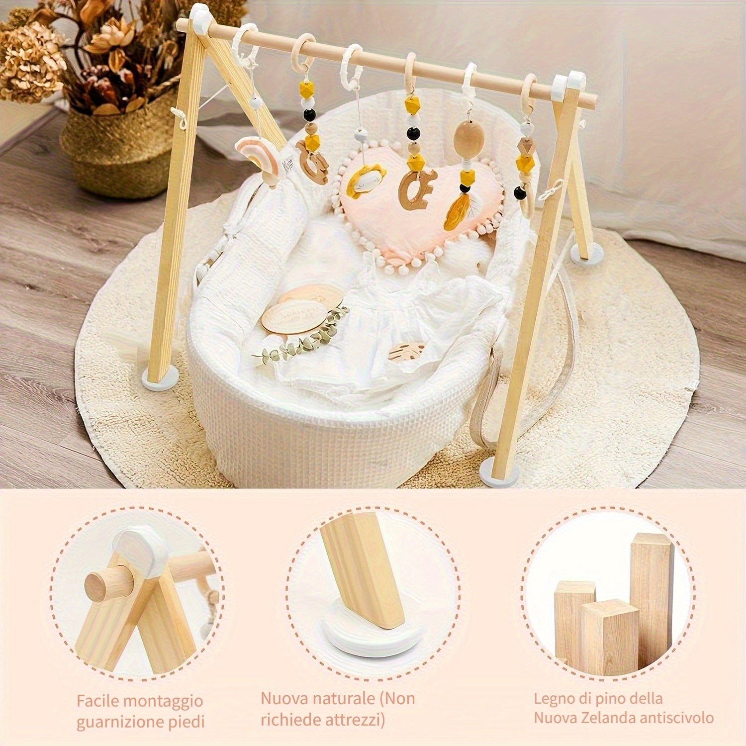 Gym per Bambini in Legno Pieghevole LABEBE con 6 Giocattoli Sospesi - Telaio di Gioco in Legno di Pino Naturale per 0-12 Mesi, Facile Montaggio con Barra Appesa, Regalo per Neonati Maschi e Femmine, Tappetino da Gioco