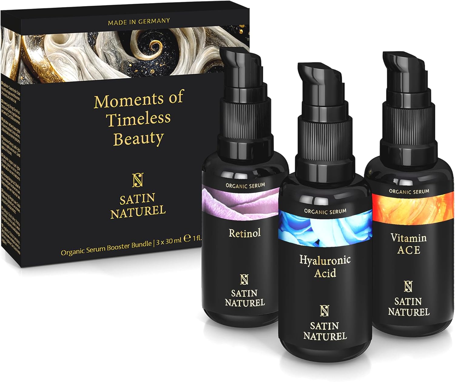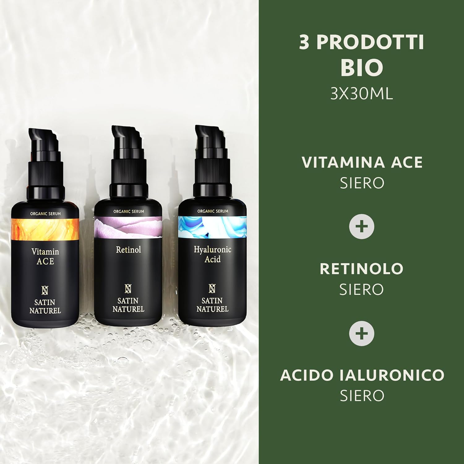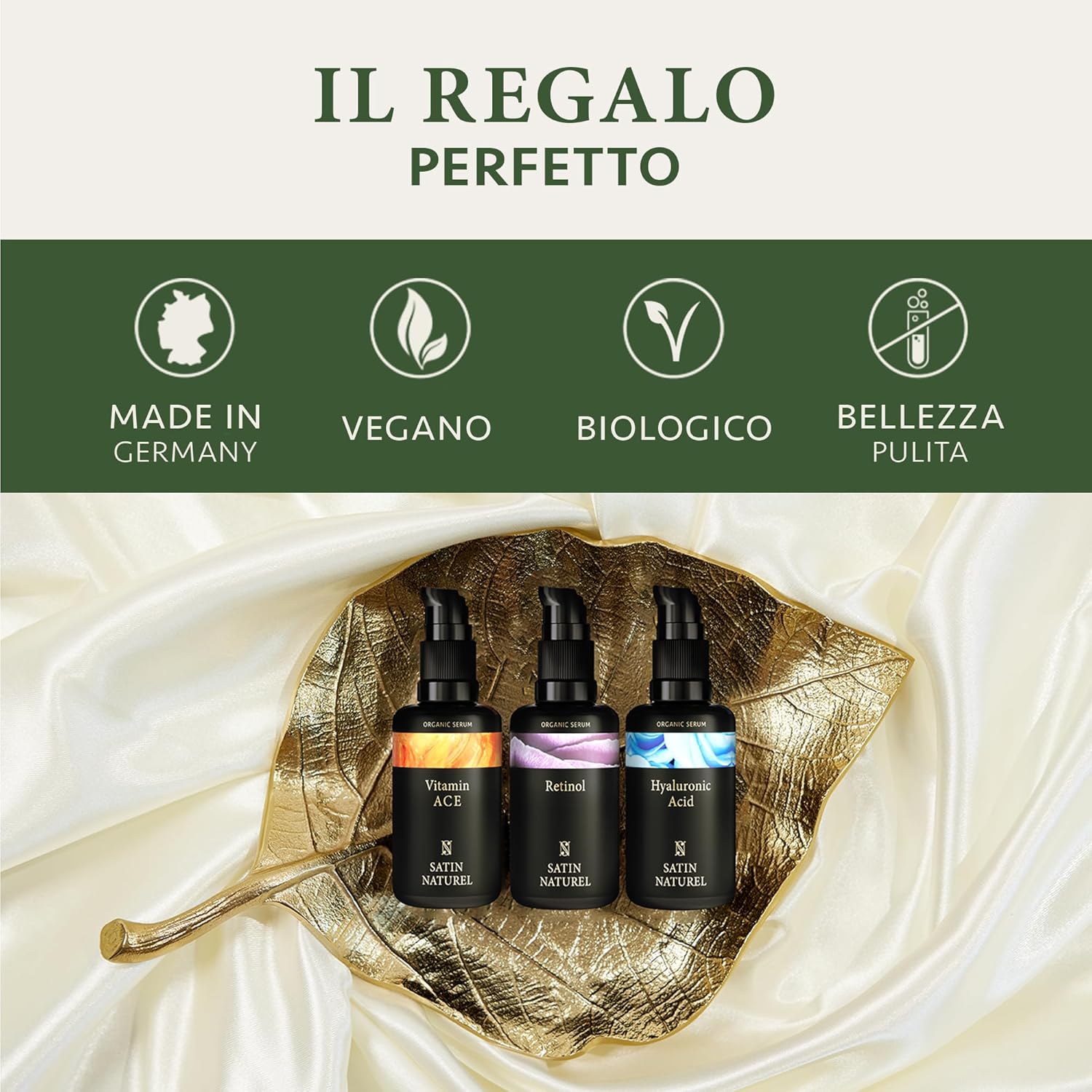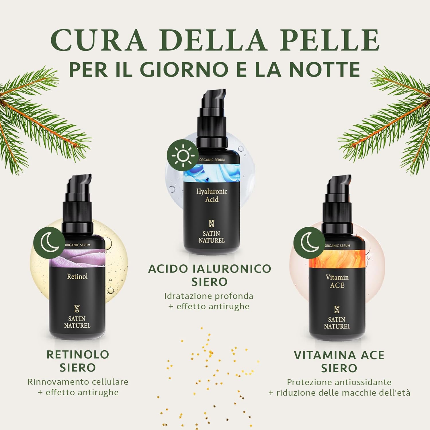 Idee Regalo Donna Compleanno - Scatola Regalo con Siero Idratante Viso Acido Ialuronico Viso + Siero Retinolo Viso + Siero Vitamina C 3x30ml, Skin Care Kit Viso Satin Naturel