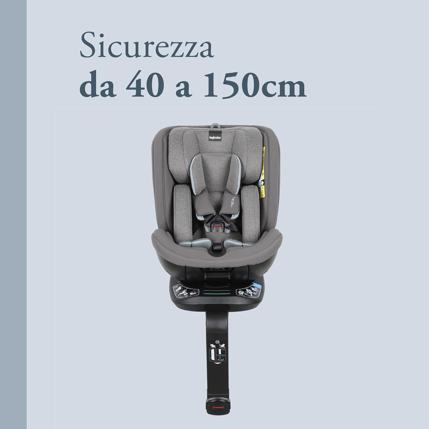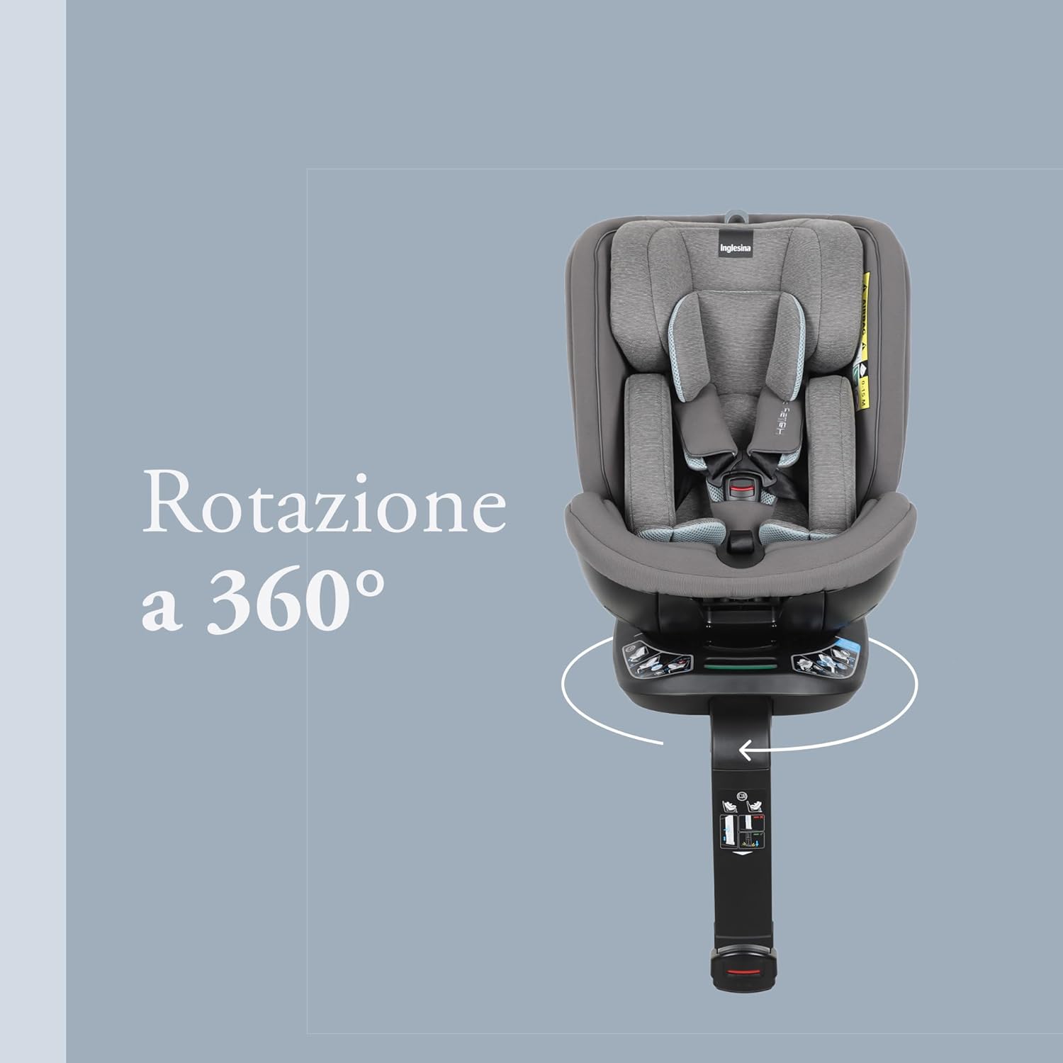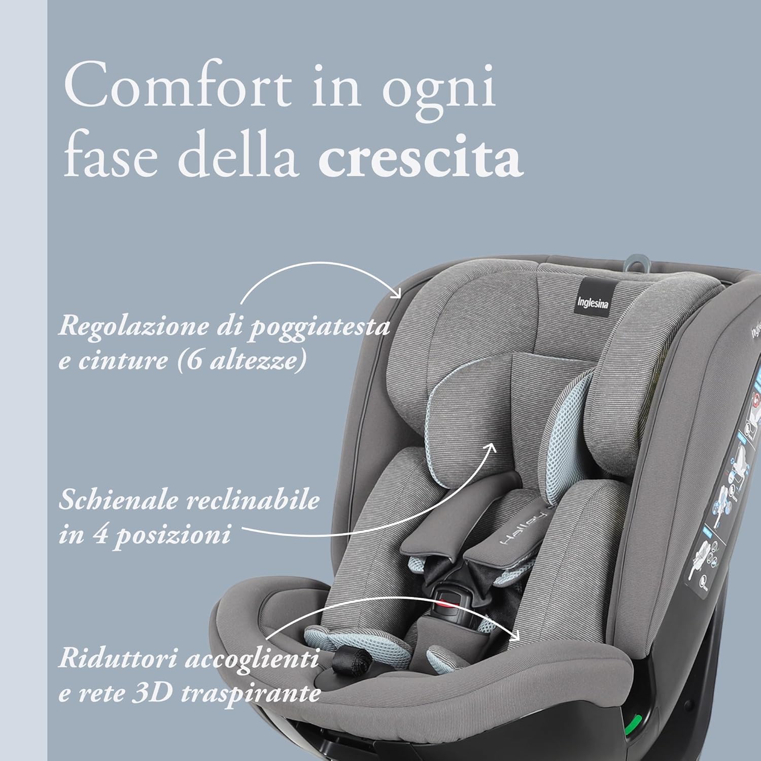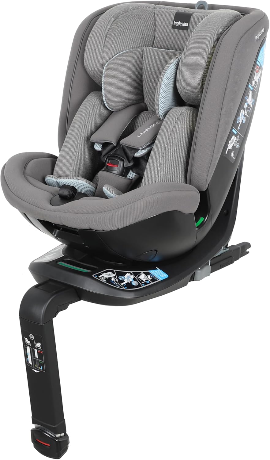 Inglesina Halley Pro, Grey, Seggiolino Auto Rotante 360° ISOFIX, da 0 a 12 Anni (40-150 cm), Reclinabile e Traspirante, Omologato ECE R129/03