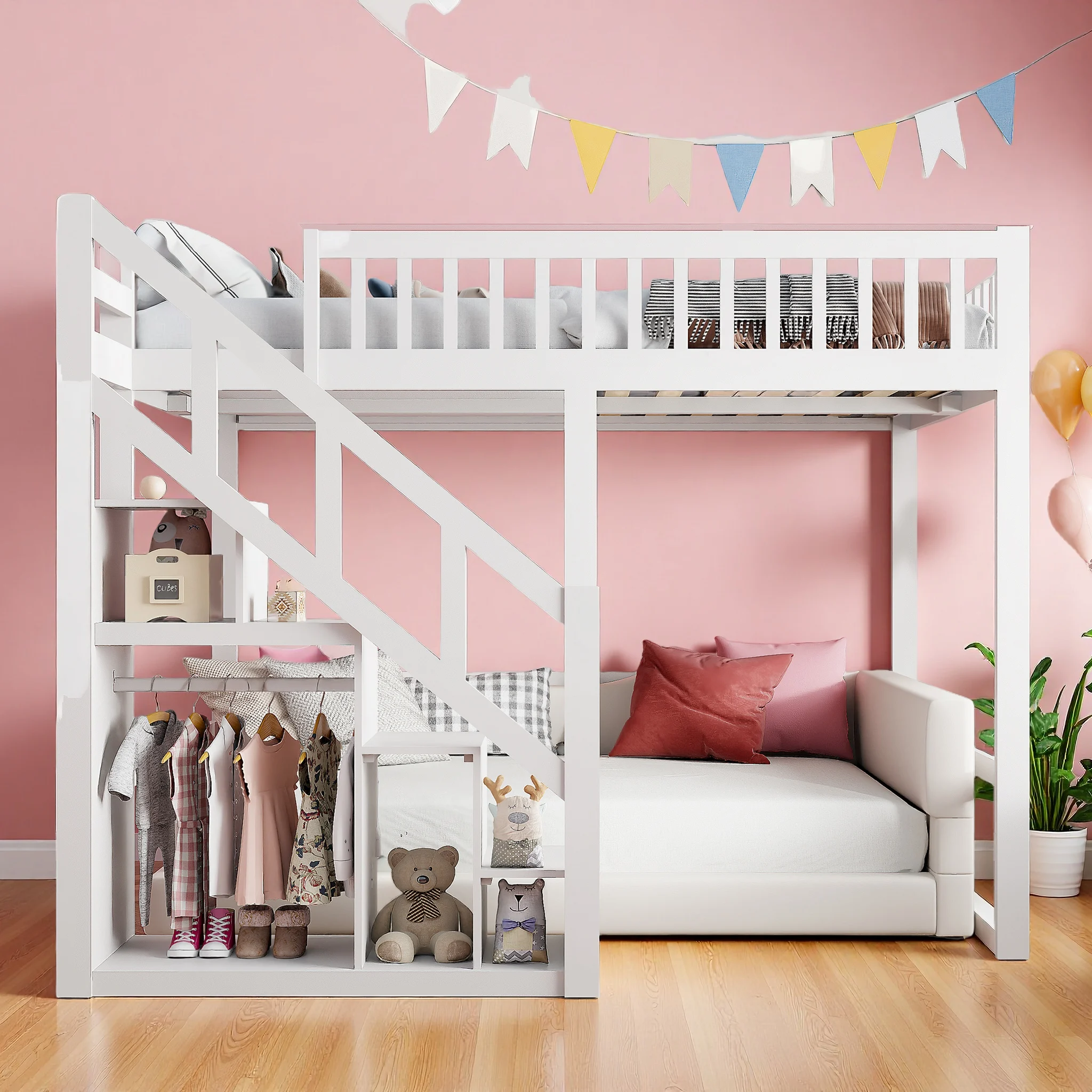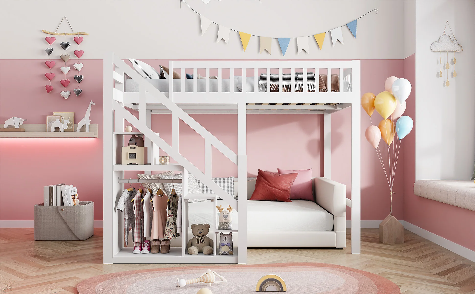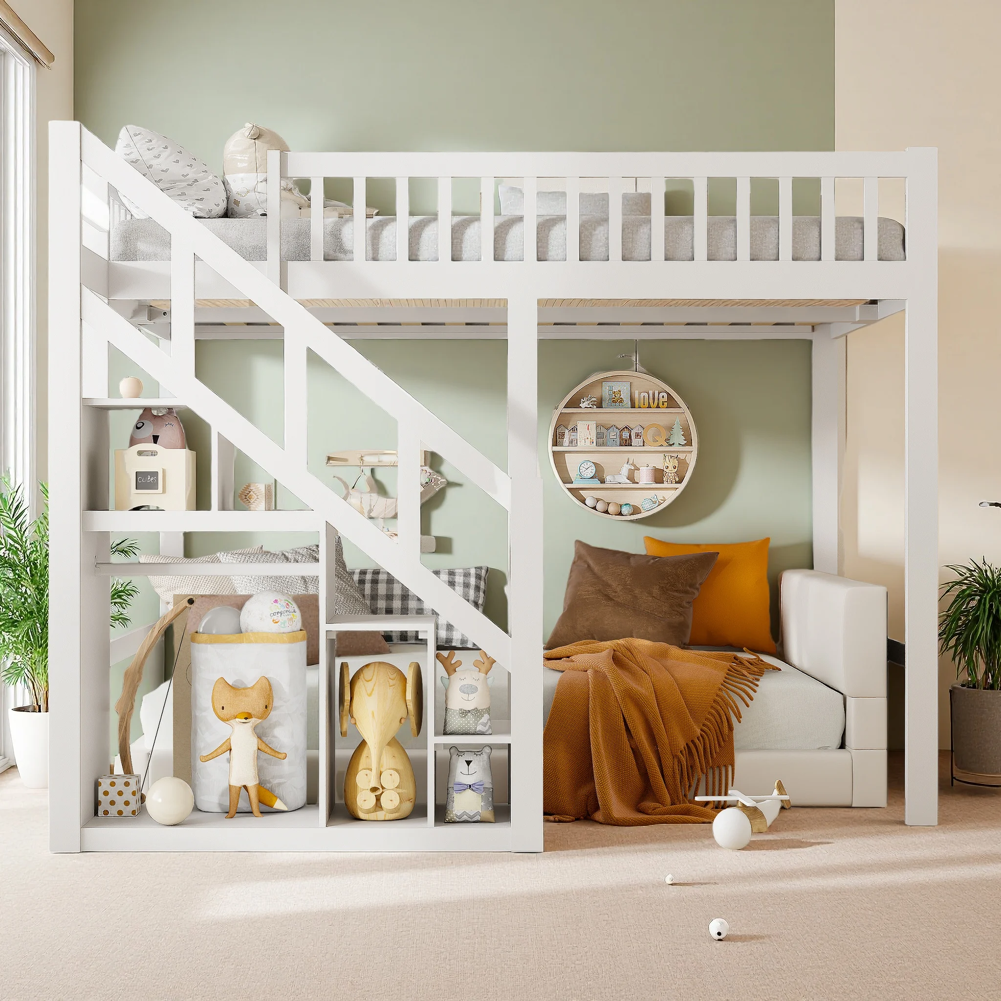 Il design di questo letto a soppalco per bambini 90x200 cm ottimizza lo spazio sotto il letto, creando un parco giochi, un angolo lettura o uno spazio per dormire.Stimola l'immaginazione e la vitalità dei bambini, promuovendo un'atmosfera dinamica e stimolante.Uno dei principali vantaggi di questo letto a soppalco è la sua scala con vano contenitore integrato.Ogni scaffale è progettato per fungere da contenitore, offrendo ampio spazio per riporre giocattoli, libri, vestiti e altri oggetti essenziali, in modo organizzato e a portata di mano.Questo letto a soppalco con contenitore è la soluzione ideale per ottimizzare lo spazio: non solo permette di dormire, ma è anche un elemento d'arredo versatile che unisce sicurezza, comfort e funzionalità.