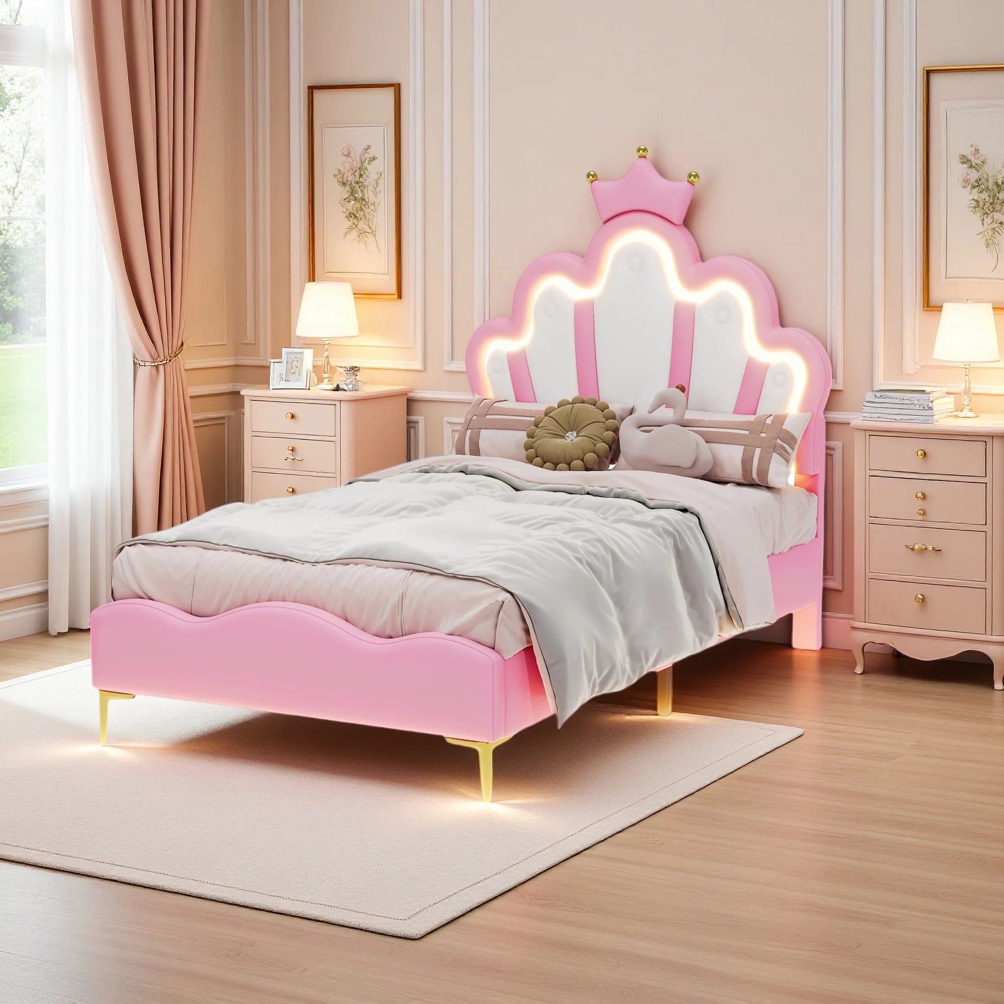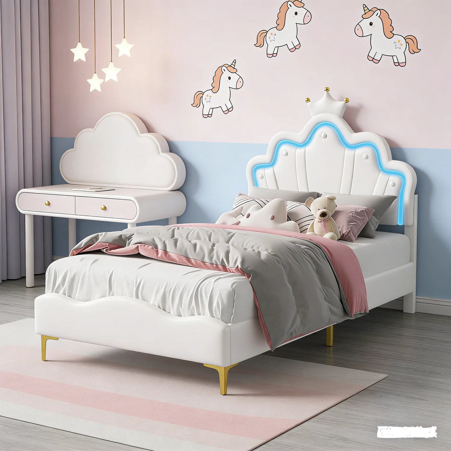 Questo letto per ragazza da 90x200 cm ha un design minimalista e lineare, che incarna uno stile elegante e contemporaneo.La testiera, a forma di nuvola, evoca un'affascinante corona.Morbido e confortevole, crea un'atmosfera diurna nella camera da letto.Il suo design esterno unico dona un tocco di eleganza e novità alla stanza.Il letto è dotato di illuminazione d'atmosfera per la testiera e la struttura, ed è fornito di un telecomando per una facile regolazione dell'illuminazione.Realizzato con materiali di alta qualità, questo lettino per bambini garantisce robustezza e stabilità.Così non dovrai preoccuparti di danneggiare la struttura, anche se tuo figlio ci salta sopra.I suoi robusti supporti garantiscono una manutenzione sicura e un ambiente di sonno stabile.L'intero letto è progettato con eleganza e gusto, aggiungendo un tocco di lusso alla cameretta del tuo bambino.