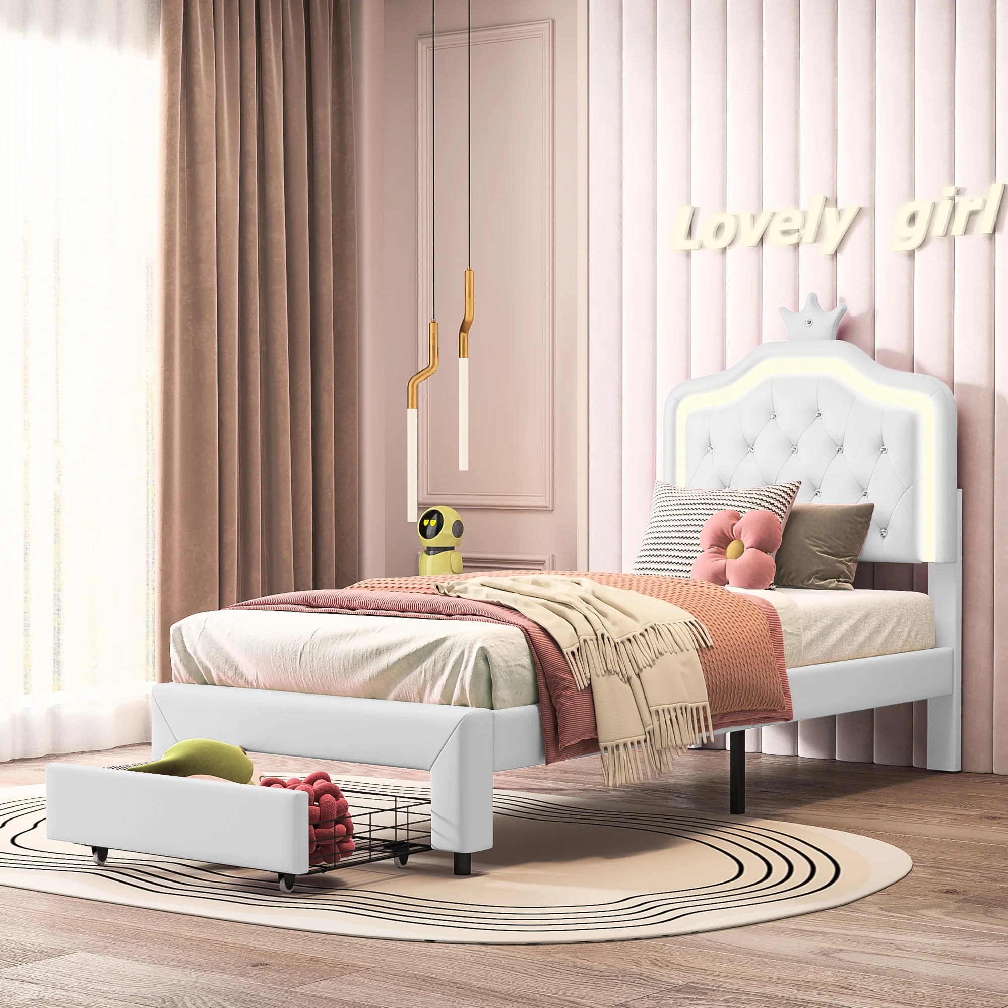 1.Design elegante con corona: questo letto per bambini irradia fascino reale con il suo design a corona da favola sulla testiera e trasforma la cameretta di ogni bambino in un piccolo castello.La struttura del letto in resistente pelle PU offre un aspetto elegante, è durevole e di facile manutenzione.Con le dimensioni di 90 x 200 cm/140 x 200 cm, è perfetto per bambini e adolescenti che apprezzano lo stile e il comfort.2.Testiera a LED per illuminazione individuale: la testiera è dotata di strisce luminose a LED, le luci a LED ad alta efficienza energetica creano una luce soffusa che crea un ambiente rilassante e ispira l'immaginazione del tuo bambino.