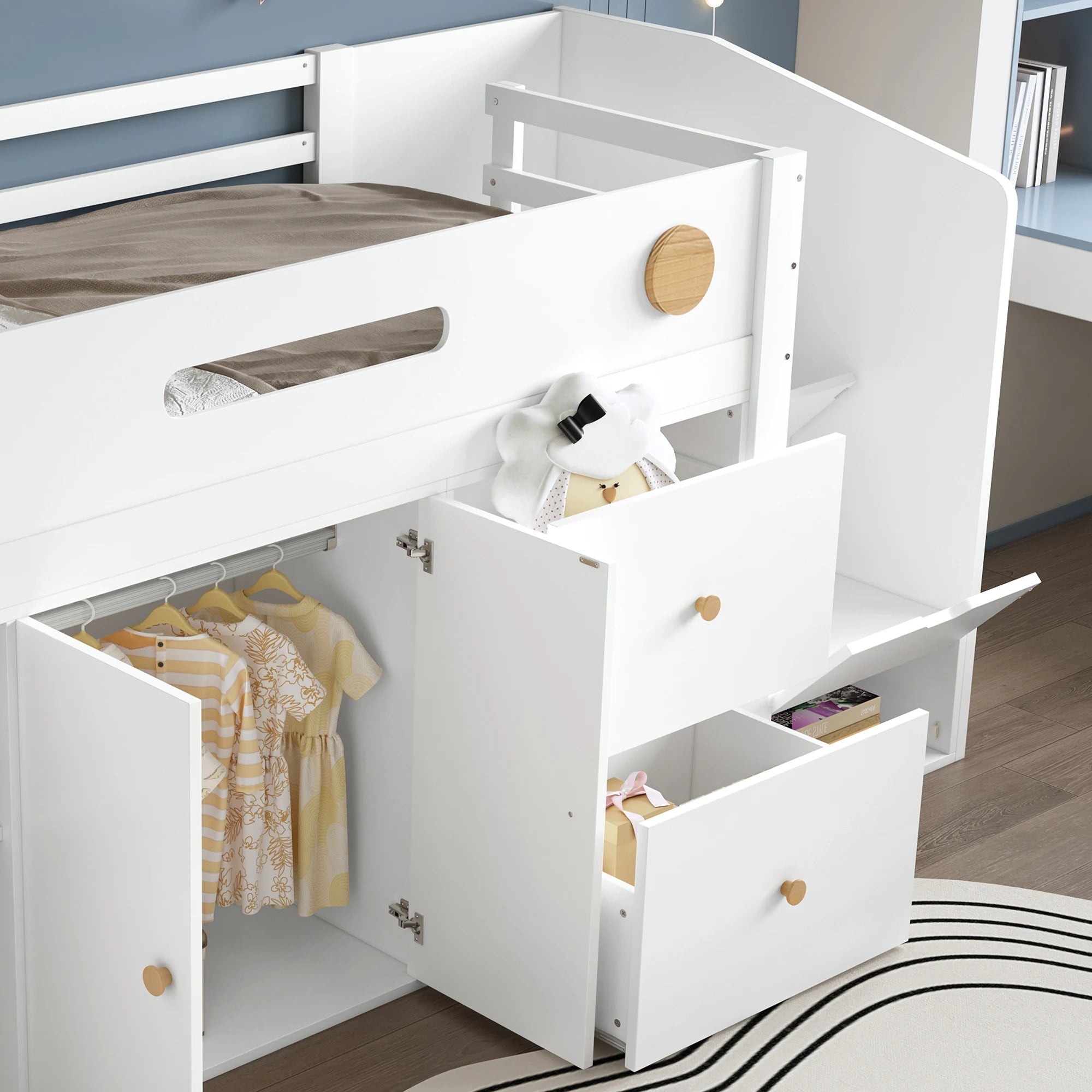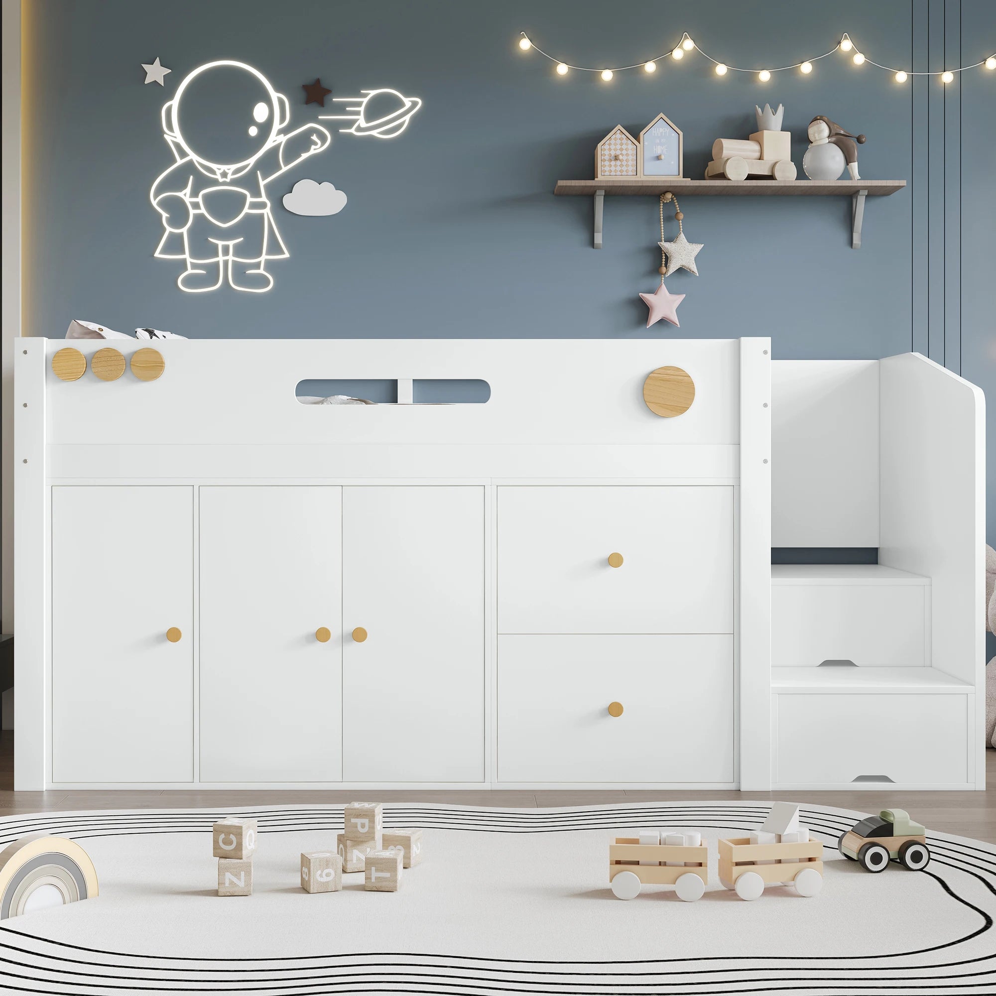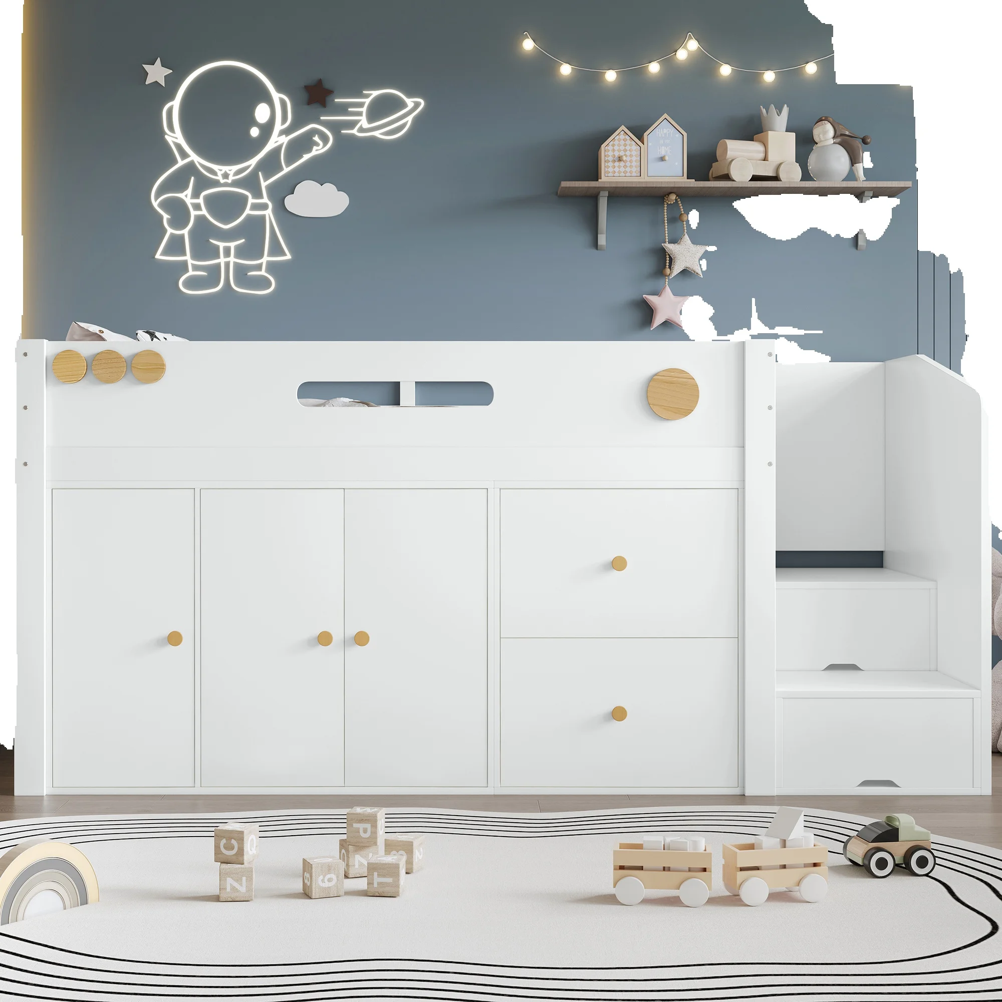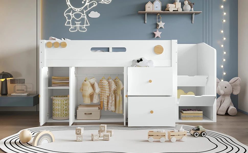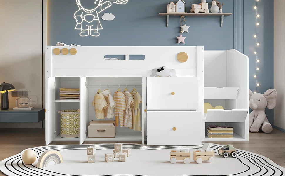 Maggiori opzioni di stoccaggio: dotato di due ampi cassetti e un armadio integrato che offrono spazio sufficiente per giocattoli, vestiti o biancheria da letto per mantenere l'ordine nella stanza dei BAMBINI.
