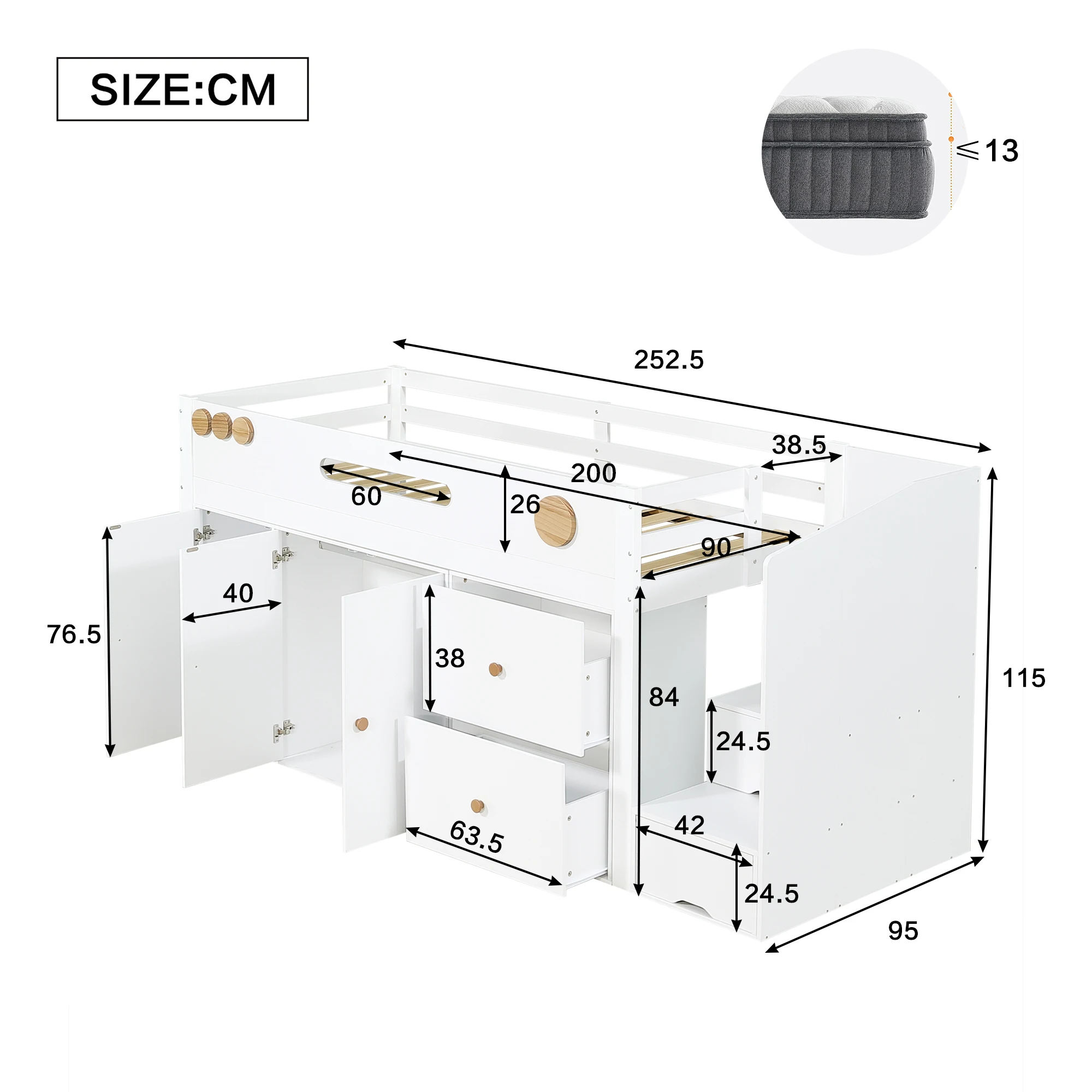 Letto in legno, Letto per bambini, Letto a mezza altezza, scala portaoggetti con ante magnetiche, Bianco + Natura, 90x200