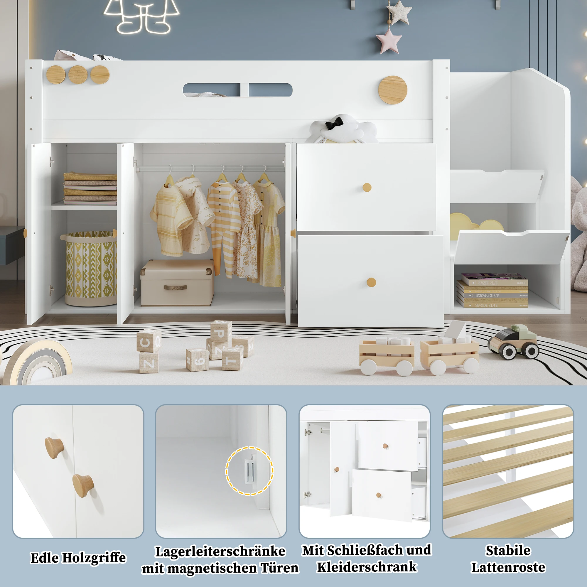 Questo letto per bambini impressiona con una combinazione ponderata di funzionalità e stabilità, che lo rende un pezzo indispensabile nella stanza di ogni BAMBINO.Le nobili maniglie in legno conferiscono al mobile un aspetto di alta qualità e consentono un funzionamento semplice e adatto ai bambini di cassetti e ante.Una caratteristica eccezionale è la scala portaoggetti con ante magnetiche: non solo serve come accesso sicuro al letto, ma offre anche un pratico spazio per riporre giocattoli o vestiti, per cui le chiusure magnetiche garantiscono una chiusura sicura e silenziosa.Il letto è inoltre dotato di un armadio integrato e di due ampi cassetti che offrono spazio sufficiente per riporre gli oggetti dei bambini e quindi mantengono l'ordine nella stanza dei BAMBINI.Le sue robuste reti a doghe garantiscono un solido supporto che garantisce un sonno ristoratore e una lunga durata.Nell'armoniosa coordinazione cromatica tra bianco e natura, si adatta perfettamente alle varie decorazioni della stanza dei BAMBINI.