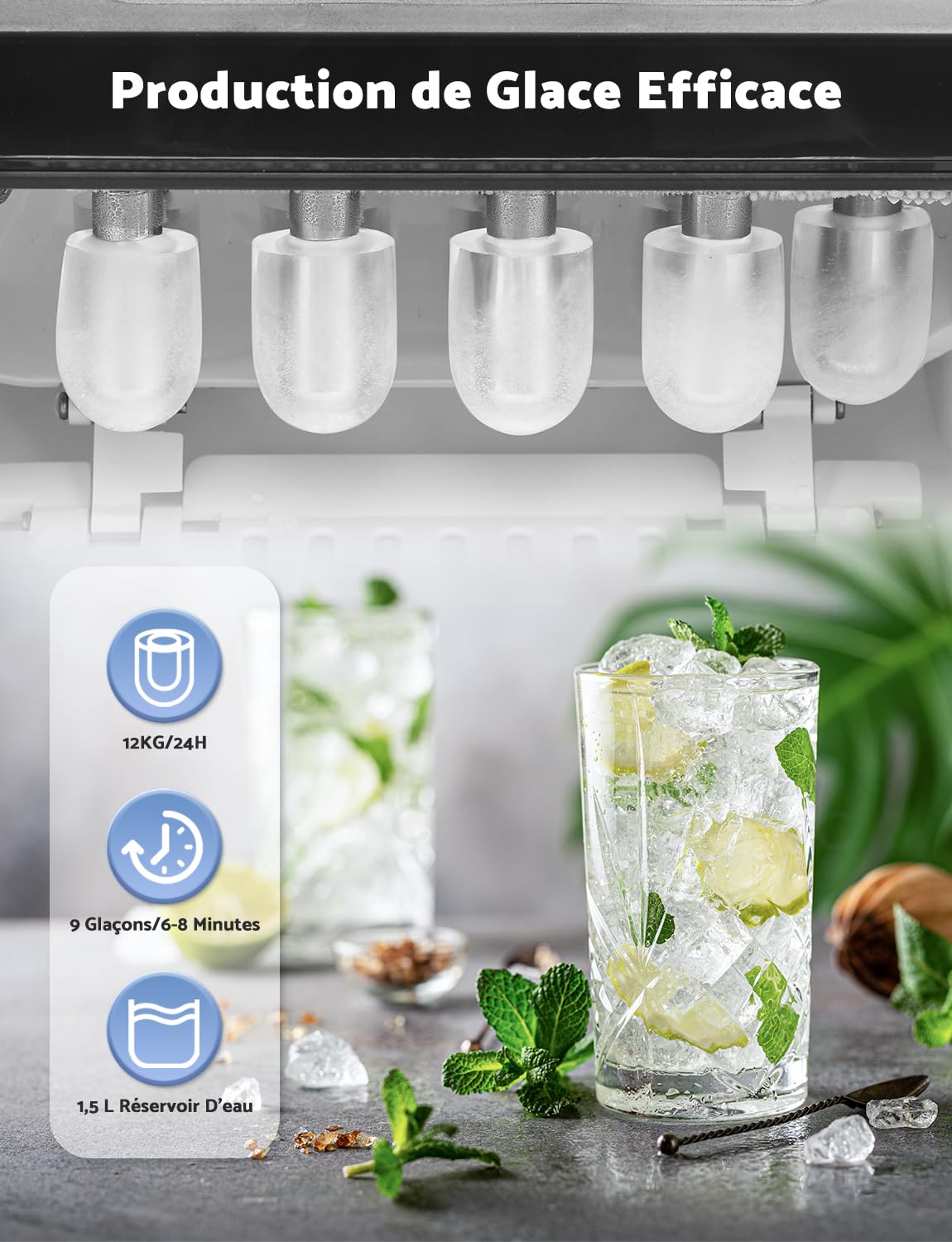 Macchina Ghiaccio 12kg/24h, Macchina del Ghiaccio Casa Autopulente, Macchina per il Ghiaccio Professionale 1,5L, Pronto in 6-12 Minuti, con Maniglia/Silenzioso/Paletta/Cestello, Nero