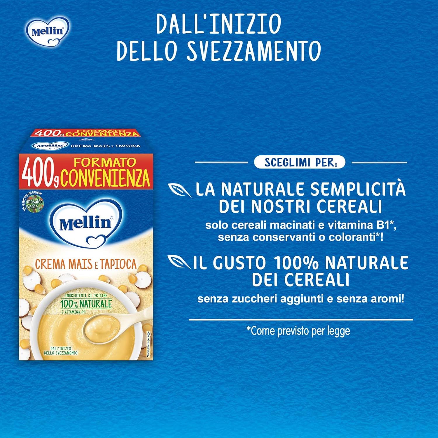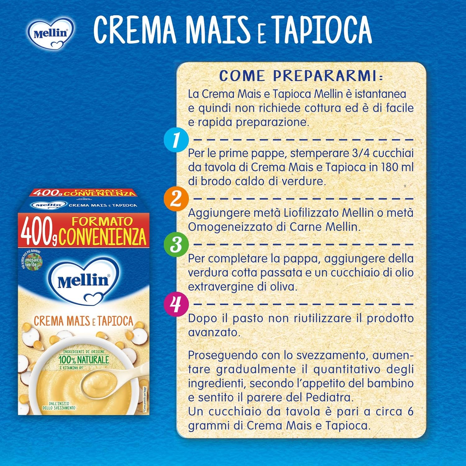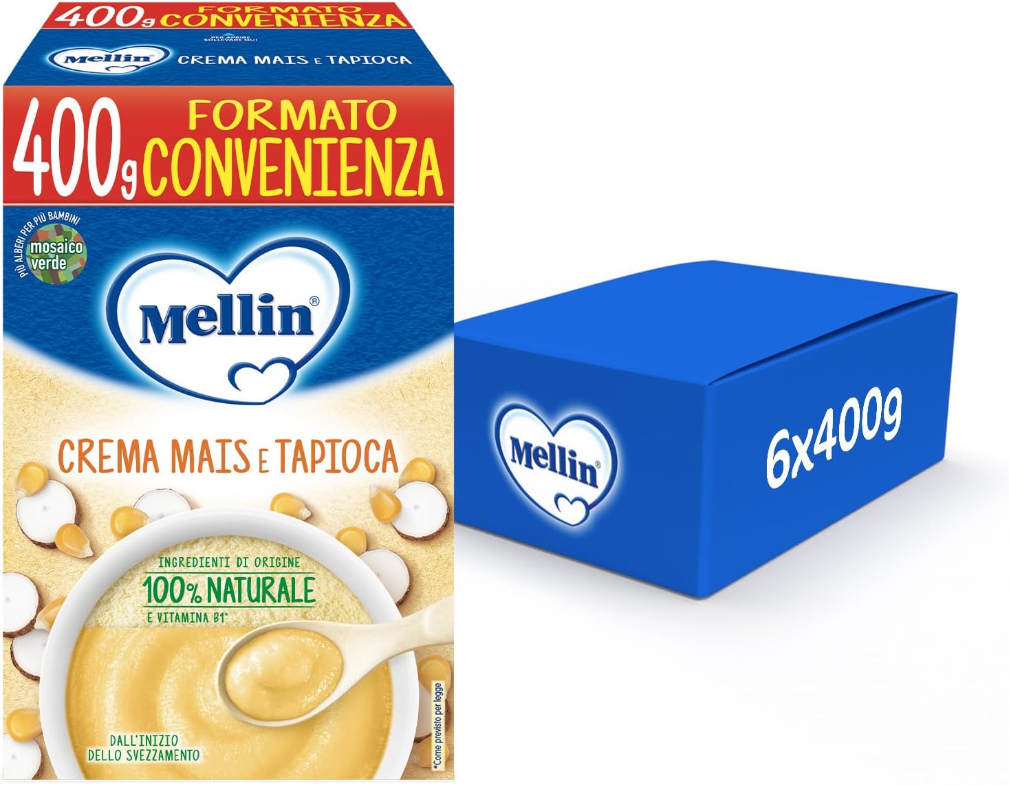 Mellin - Crema Mais e Tapioca - Alimento con vitamina B1, per Bambini dal 4° mese Compiuto - 6 Confezioni da 400gr (Totale 2400gr)