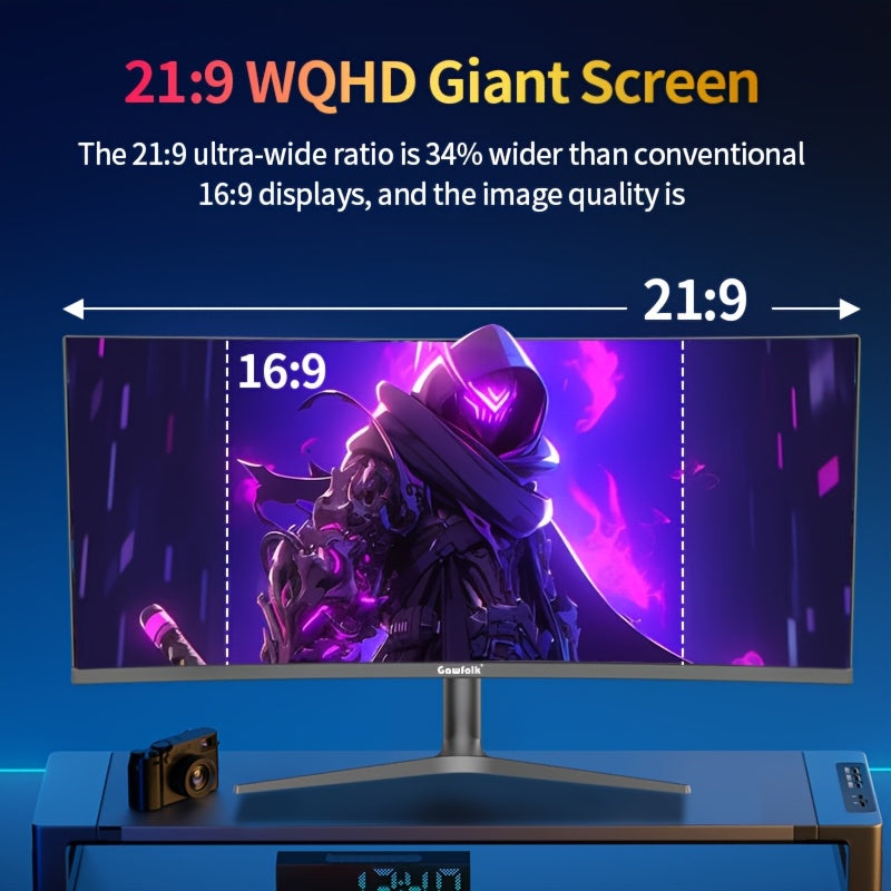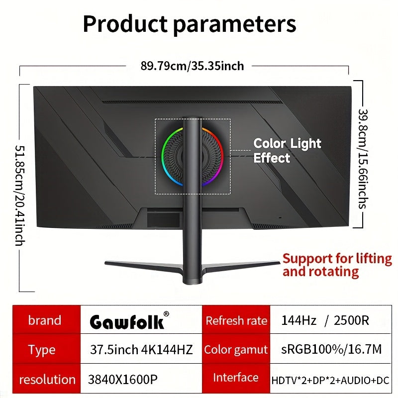 Monitor da Gioco Gawfolk 37.5 pollici con Luci Colorate, 4K UHD a 144Hz, Pannello Curvo Ultra-Wide VA 2500R, Altezza Regolabile su/giù, DisplayPort+HDTV, VESA 75x75mm, per Gaming Professionale, Schermo Vivace, Costruzione Resistente, Supporto Regolabile,