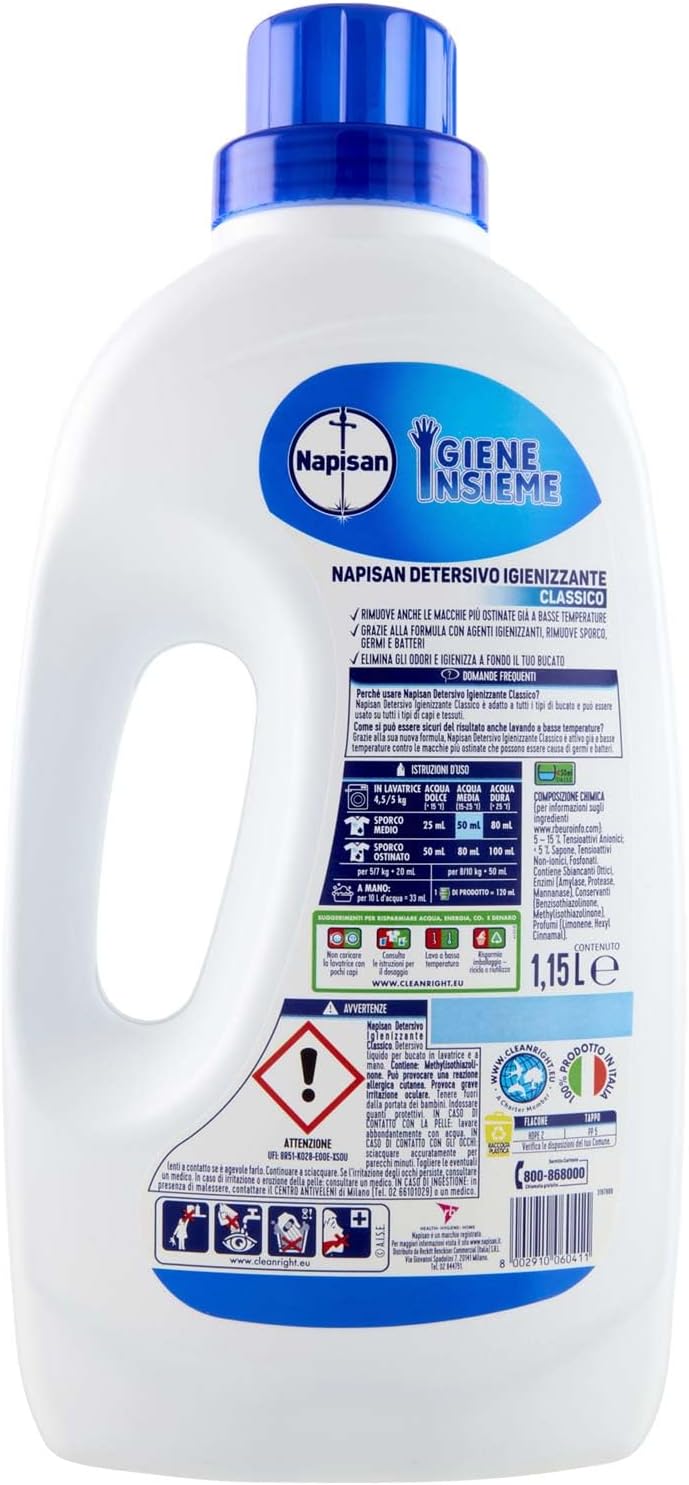 Napisan Detersivo Lavatrice Liquido, Detersivo Igienizzante, Classico 3x azione, Lavaggi, Nessun Colore, 1.15 l, Senza Profumazione. da 23 lavaggi