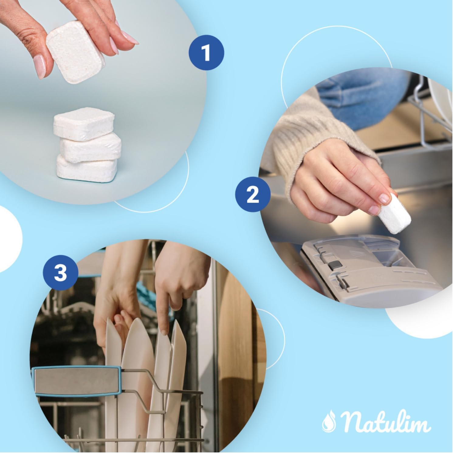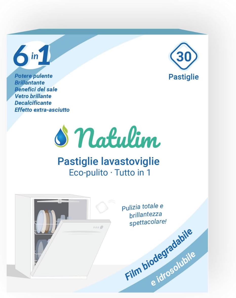 Natulim - Compresse per lavastoviglie 6 in 1 biodegradabili e idrosolubili, confezione da 30 - Pulizia profonda, risciacquo, funzione sale, protezione vetri, effetto extra secco - Made in EU
