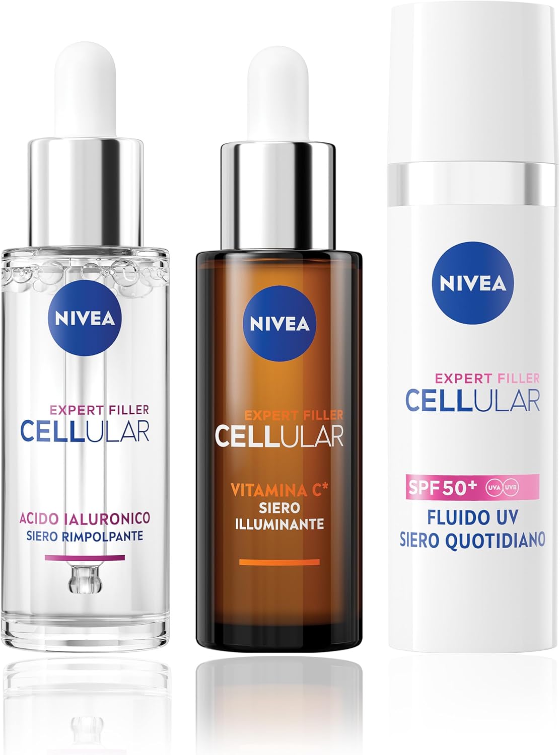 NIVEA Cellular Expert Skincare Kit, Set skincare completo con Siero Viso Acido Ialuronico Rimpolpante 30 ml, Siero Vitamina C Illuminante 30 ml e Fluido UV Quotidiano SPF50+ per layering