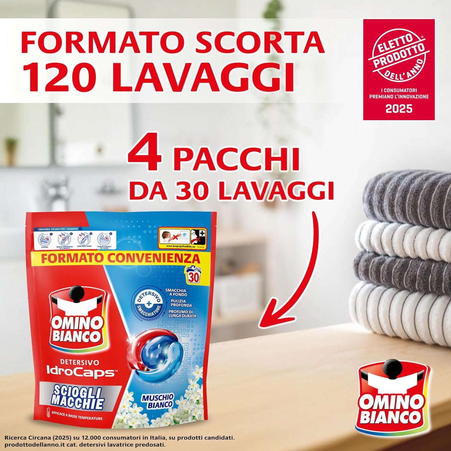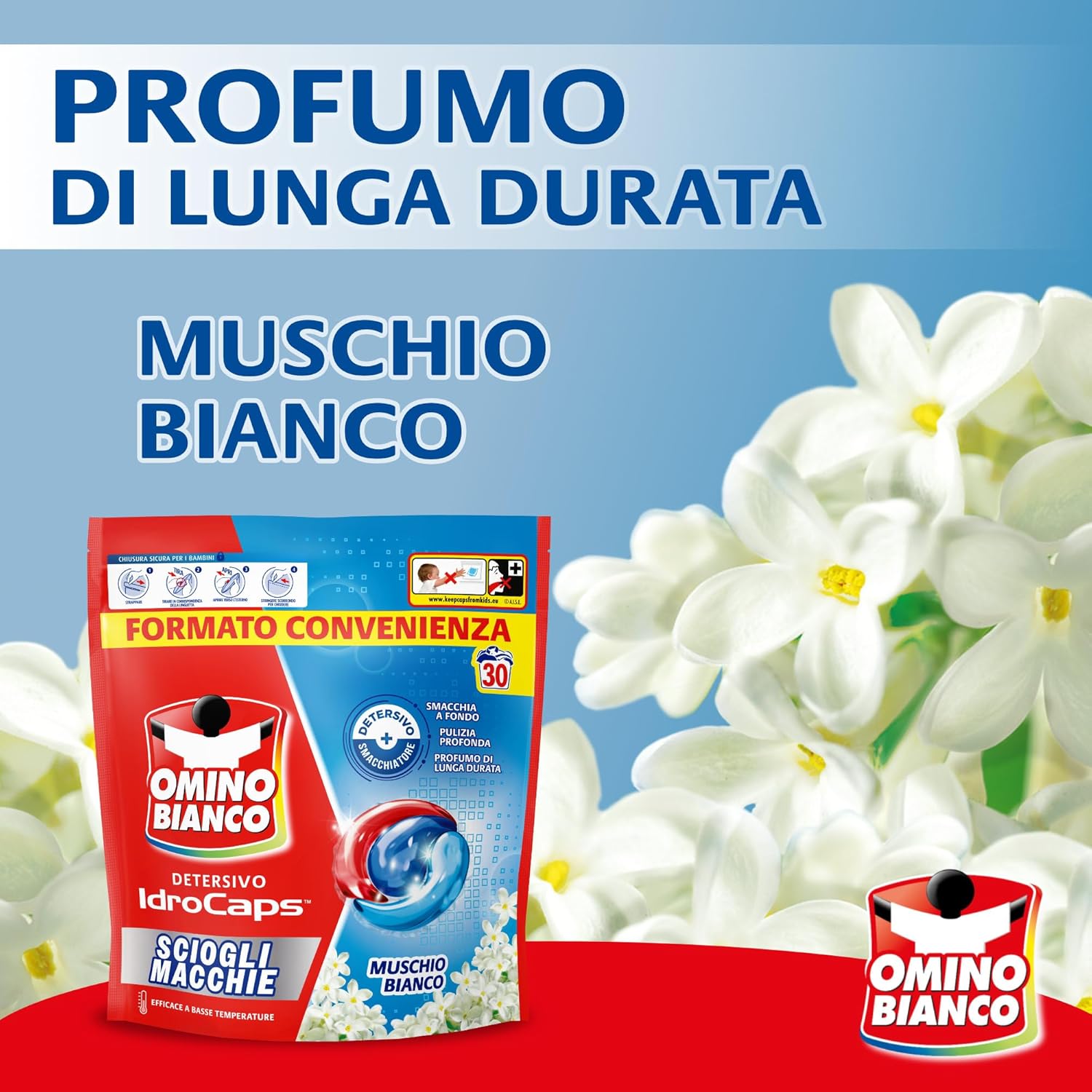 Omino Bianco Idrocaps - Detersivo Lavatrice In Capsule Sciogli Macchie, 120 Lavaggi, Efficace a Basse Temperature, Profumo Muschio Bianco, 30 Caps x 4 Confezioni