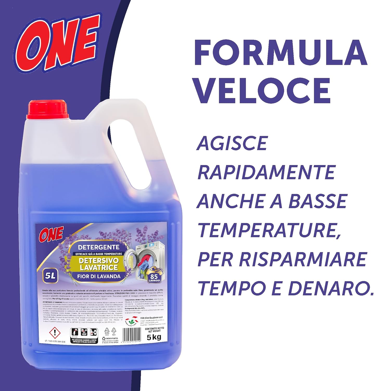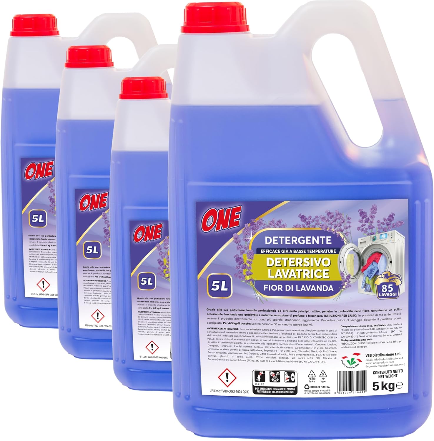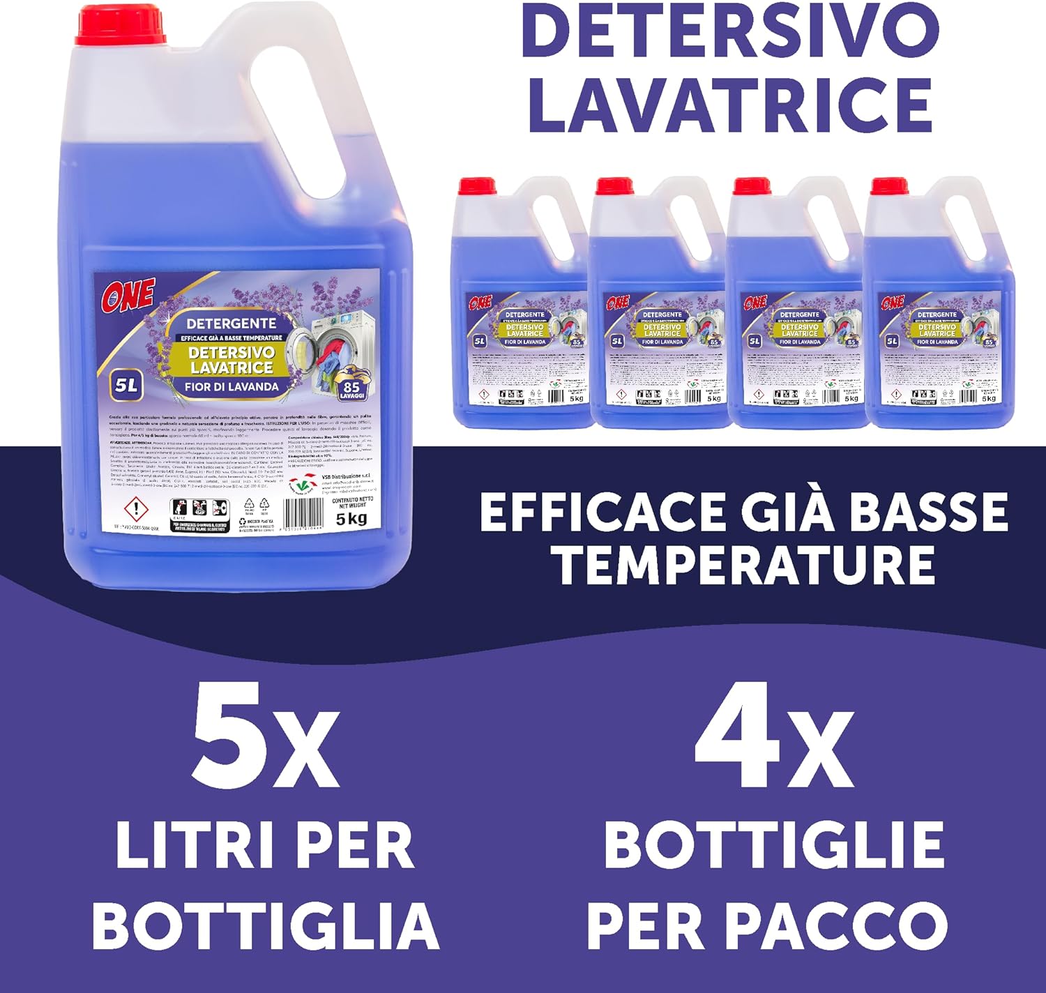 ONE - 20 Litri di detersivo liquido LAVATRICE ai FIOR DI LAVANDA (Pacco con 4 x taniche da 5 lt ciascuna - 85 lavaggi per tanica) - Detergente liquido efficace gia' a basse temperature.