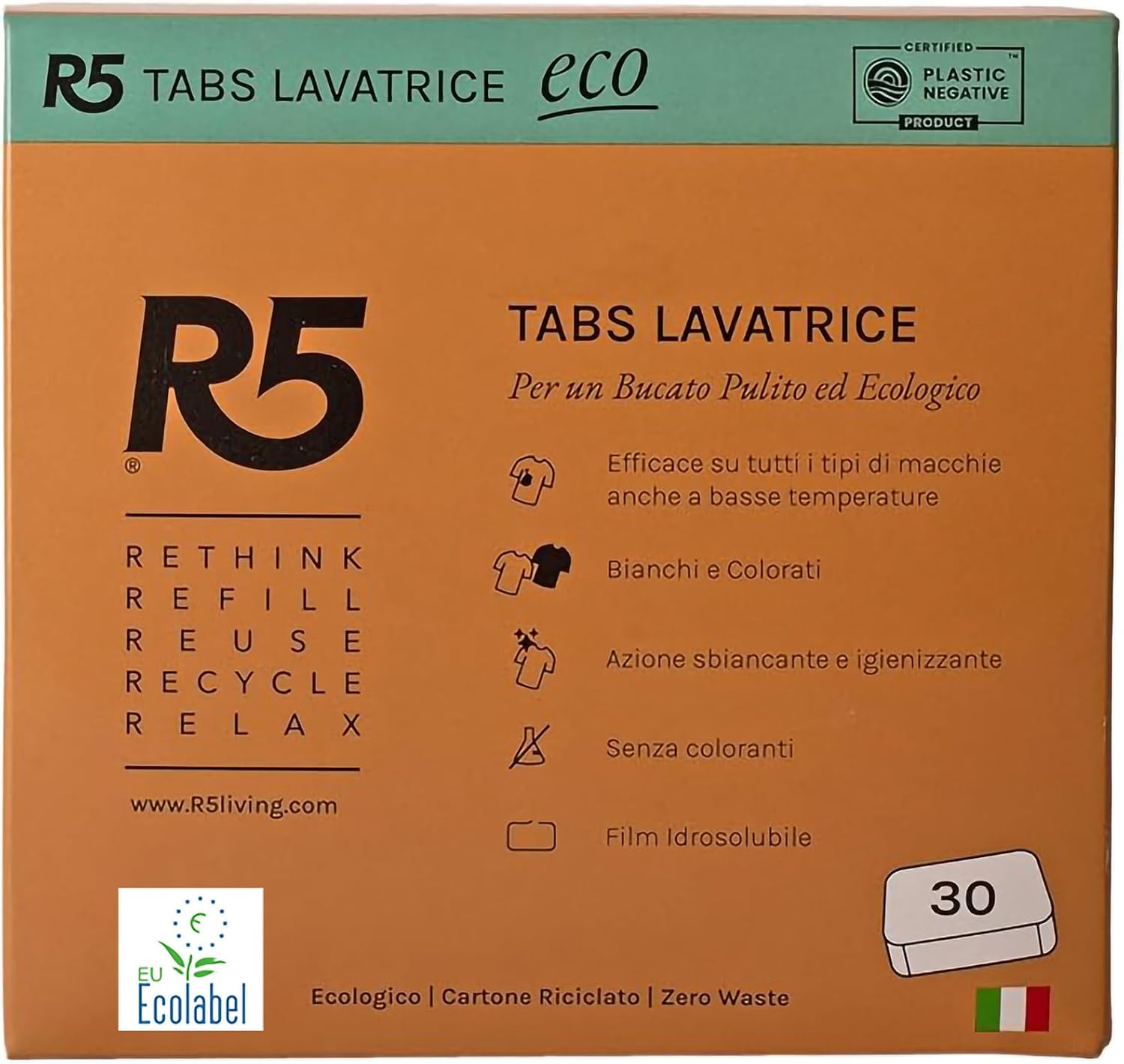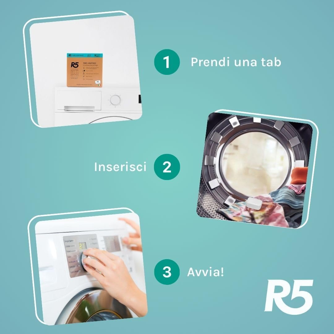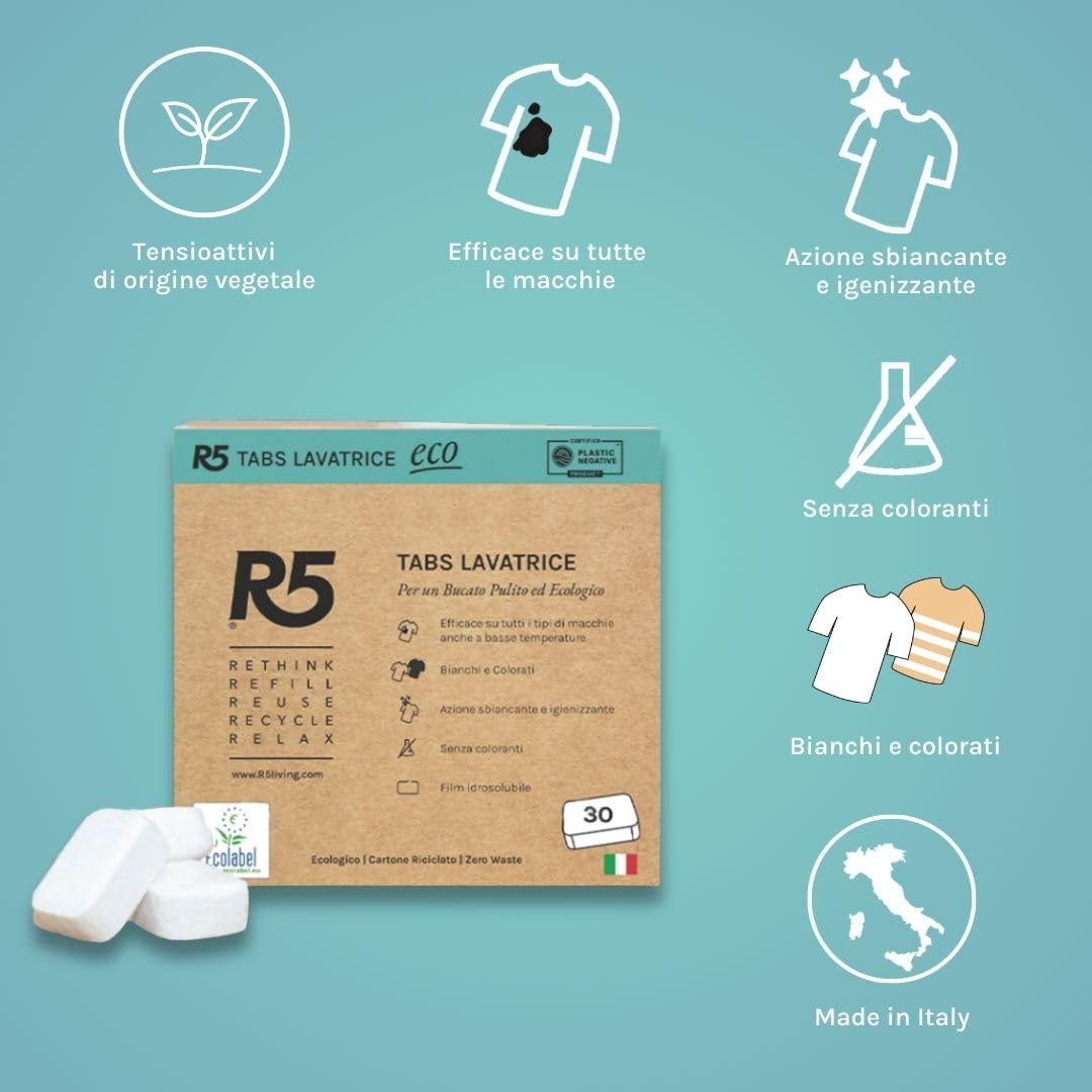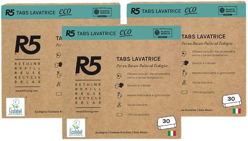 R5, Eco Tabs Lavatrice, 90 Pastiglie per la Lavatrice, con Tensioattivi di Origine Vegetale, Senza Coloranti, Certificate Ecolabel, Climate Partner e Plastic Negative, Made in Italy, 3 x 30 Pods