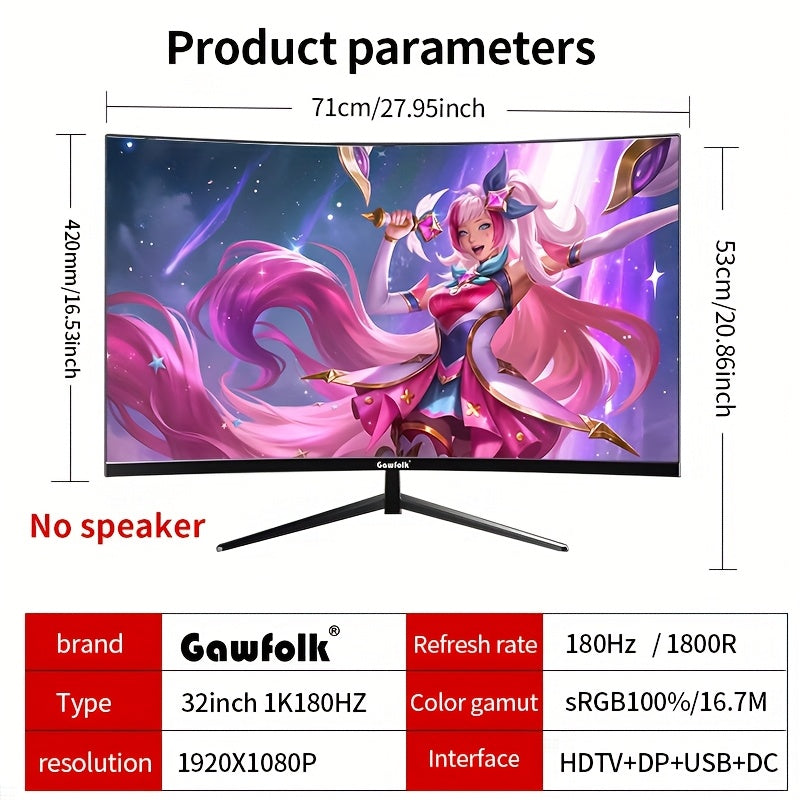 Schermo pz Gawfolk Curvo da 32 Pollici, Risoluzione Full HD 1920*1080P, Senza Altoparlanti, Cornice Incurvata 180R con Supporto VESA
