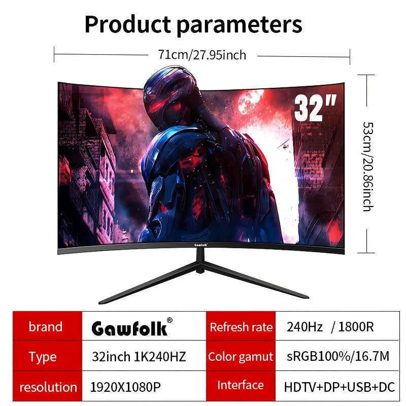 Schermo pz Gawfolk da 32 pollici, monitor da gioco 1K 240Hz, 1800R 1ms, FreeSync, 100% SRGB, HDTV2.1 DisplayPort, compatibile con montaggio a parete 75 * 75MM Wall - Nero