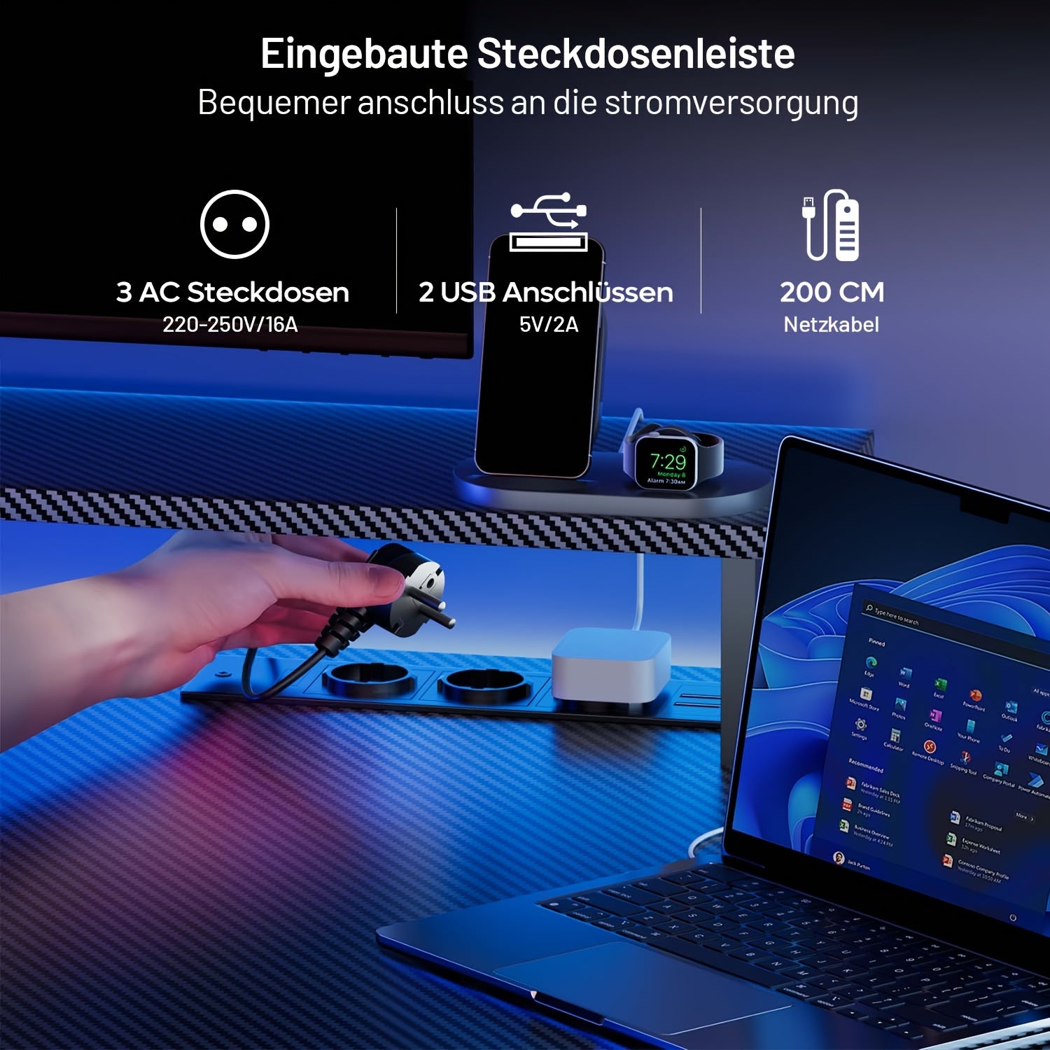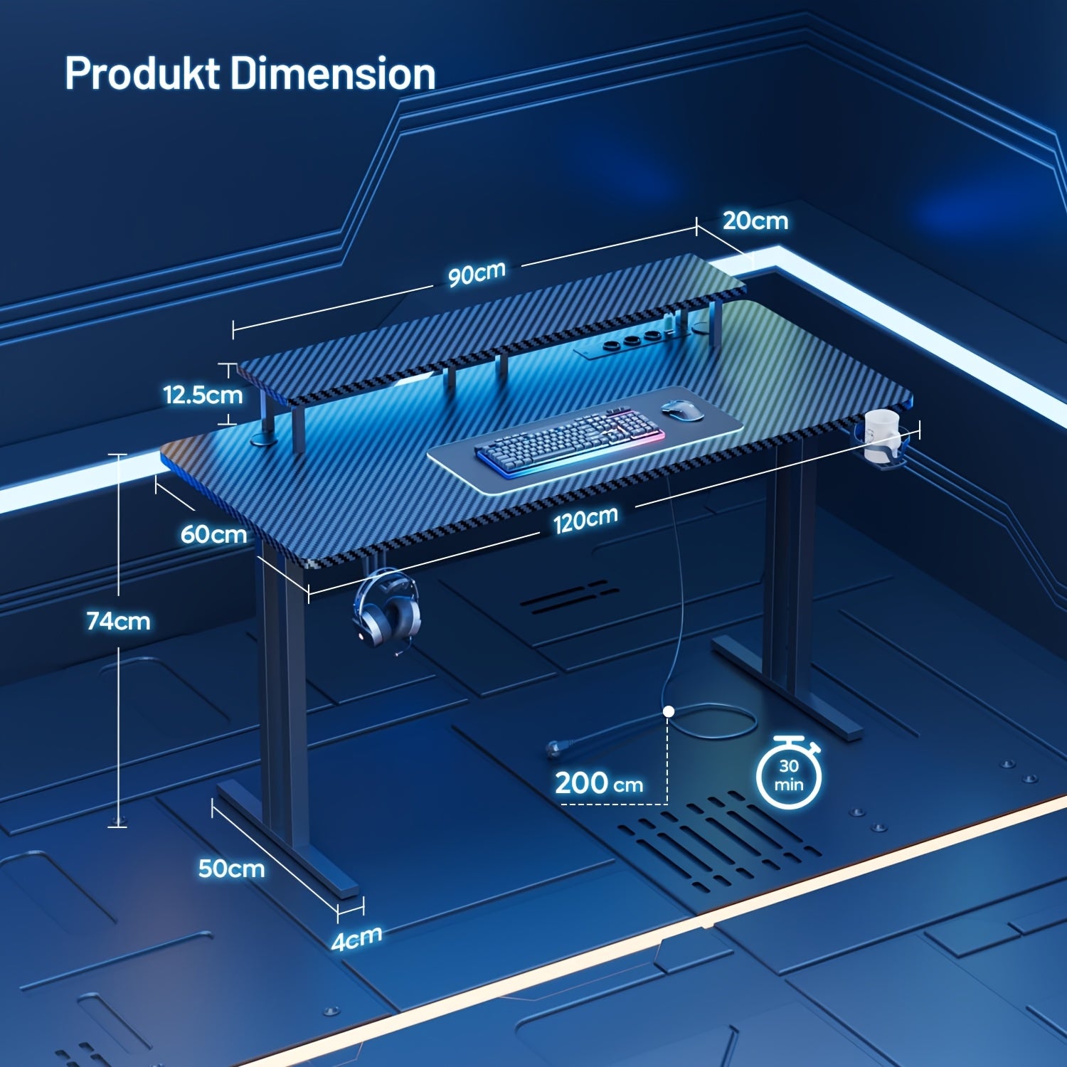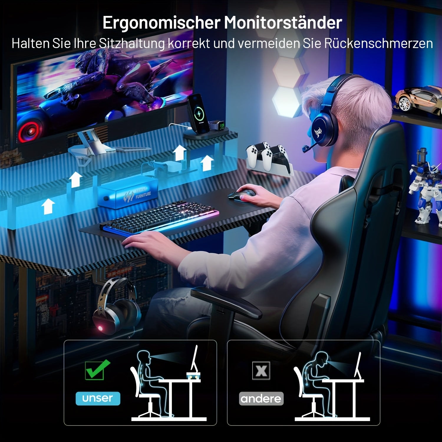 Scrivania da Gaming HLDIRECT con LED, Scrivania per Gamer con 3 Prese e 2 Porte USB, Scrivania pz Stabile per Gaming e Ufficio con Supporto Monitor, Nera