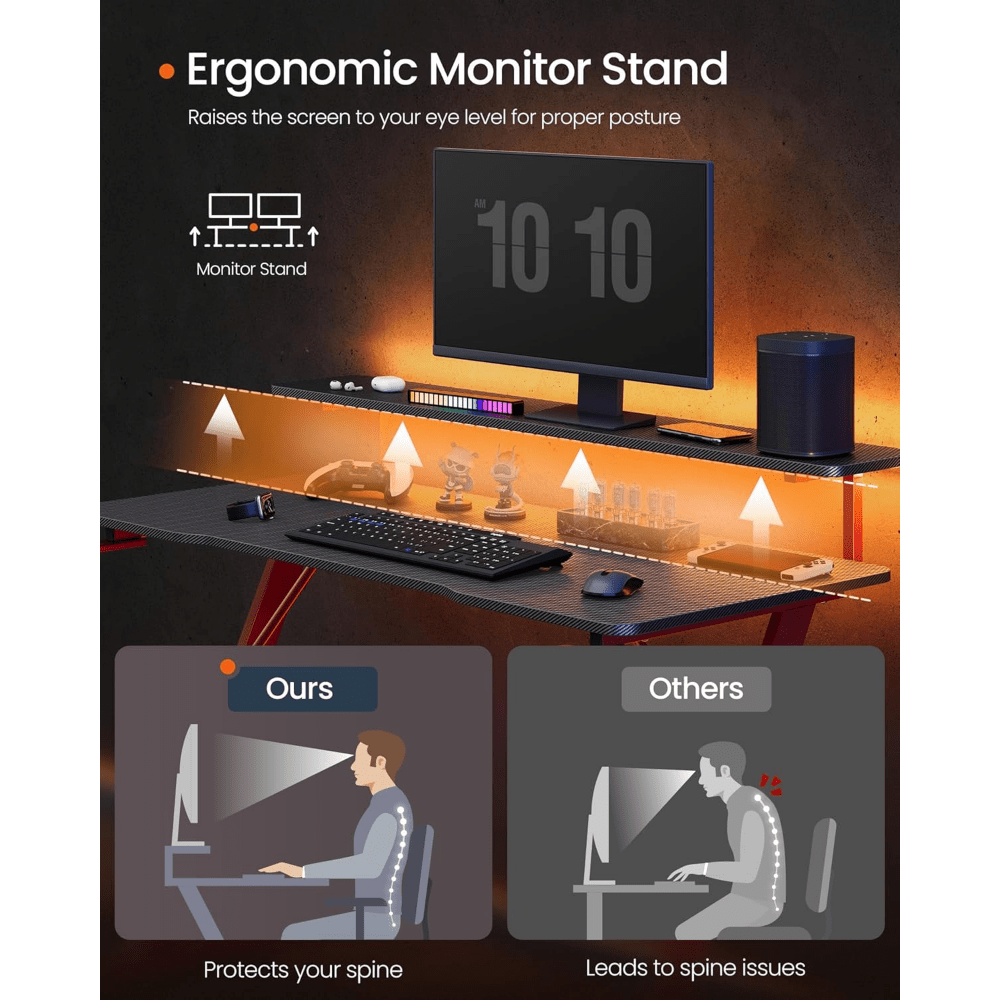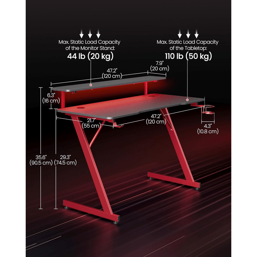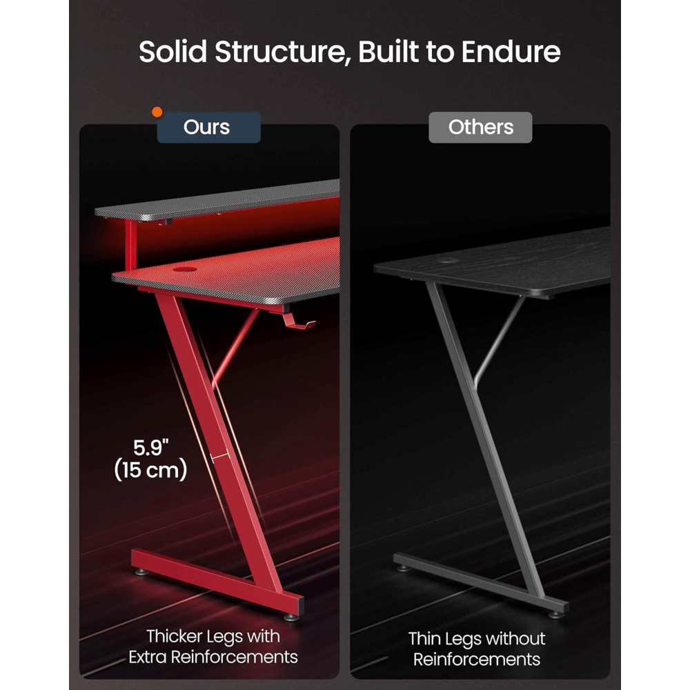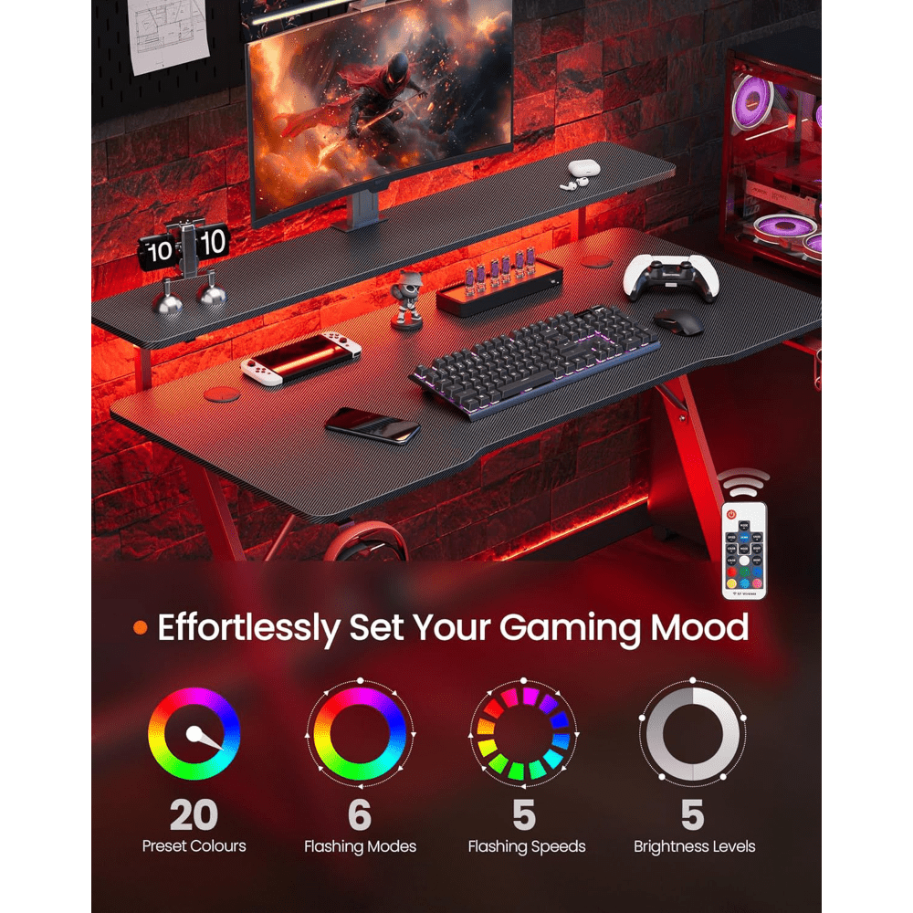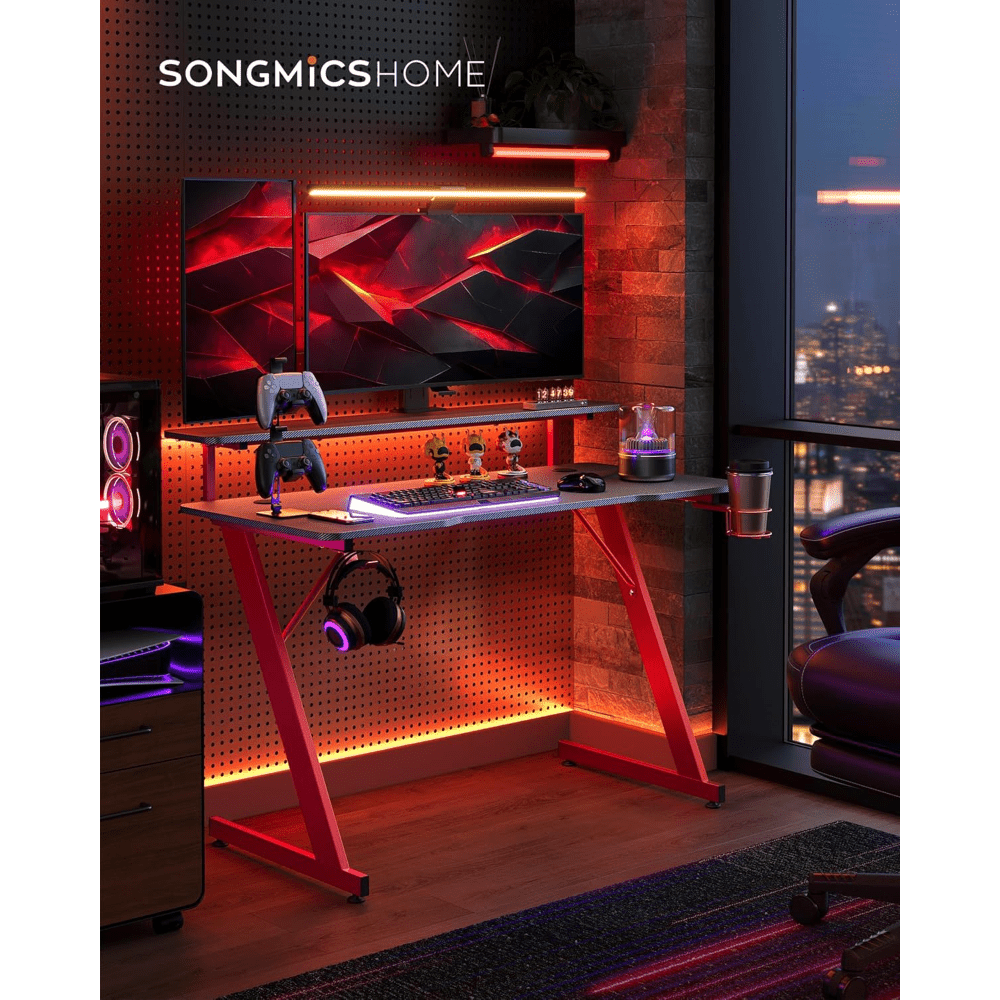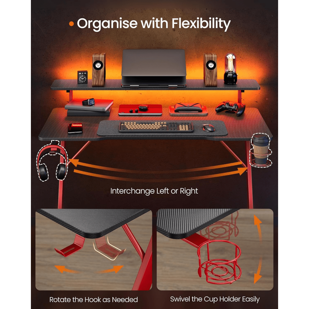 Scrivania da gioco con luci a LED, scrivania per computer a forma di Z con supporto per monitor, portabicchieri e gancio per cuffie, per ufficio domestico