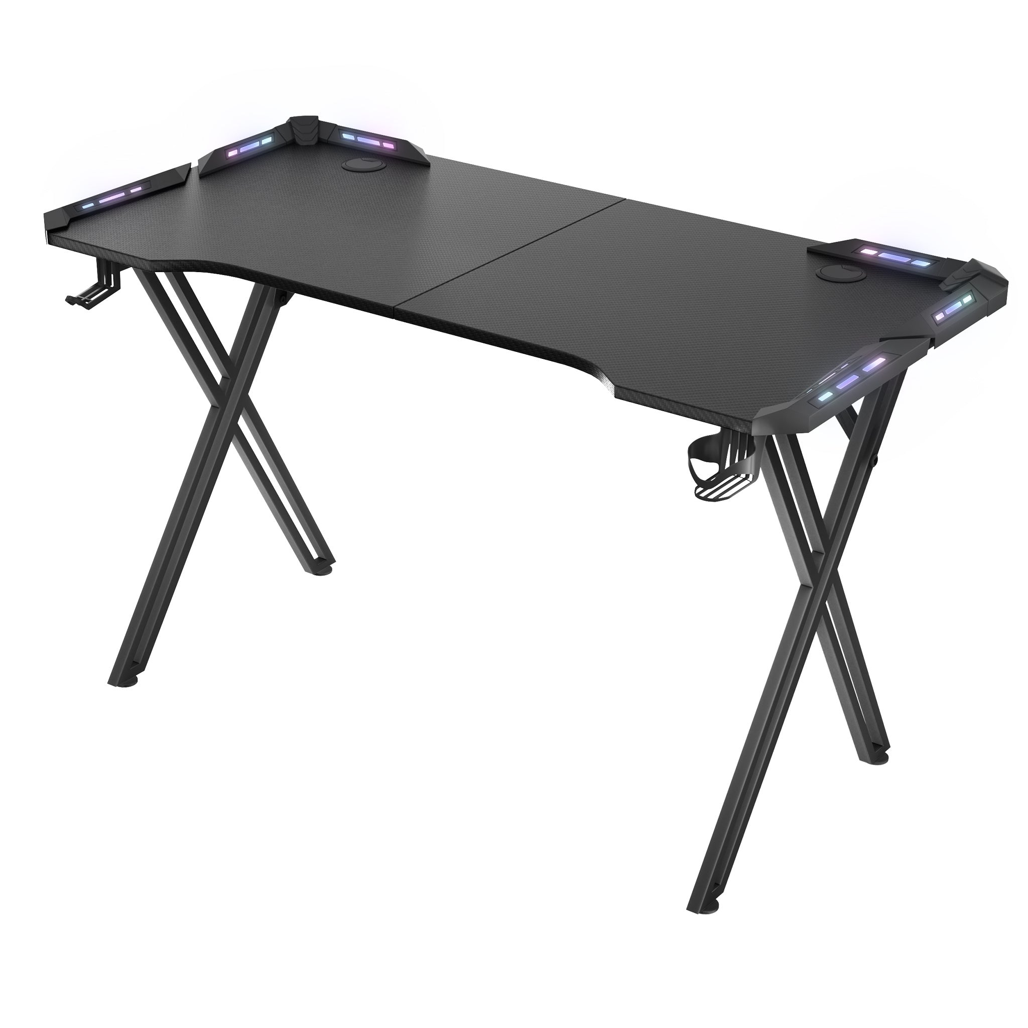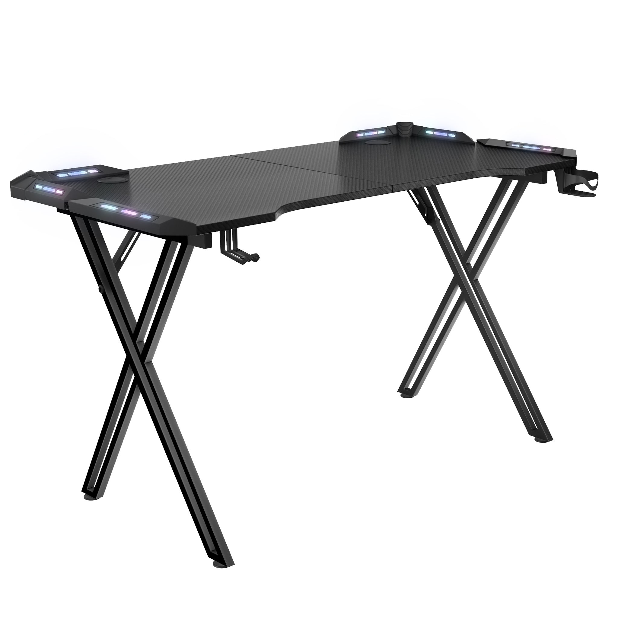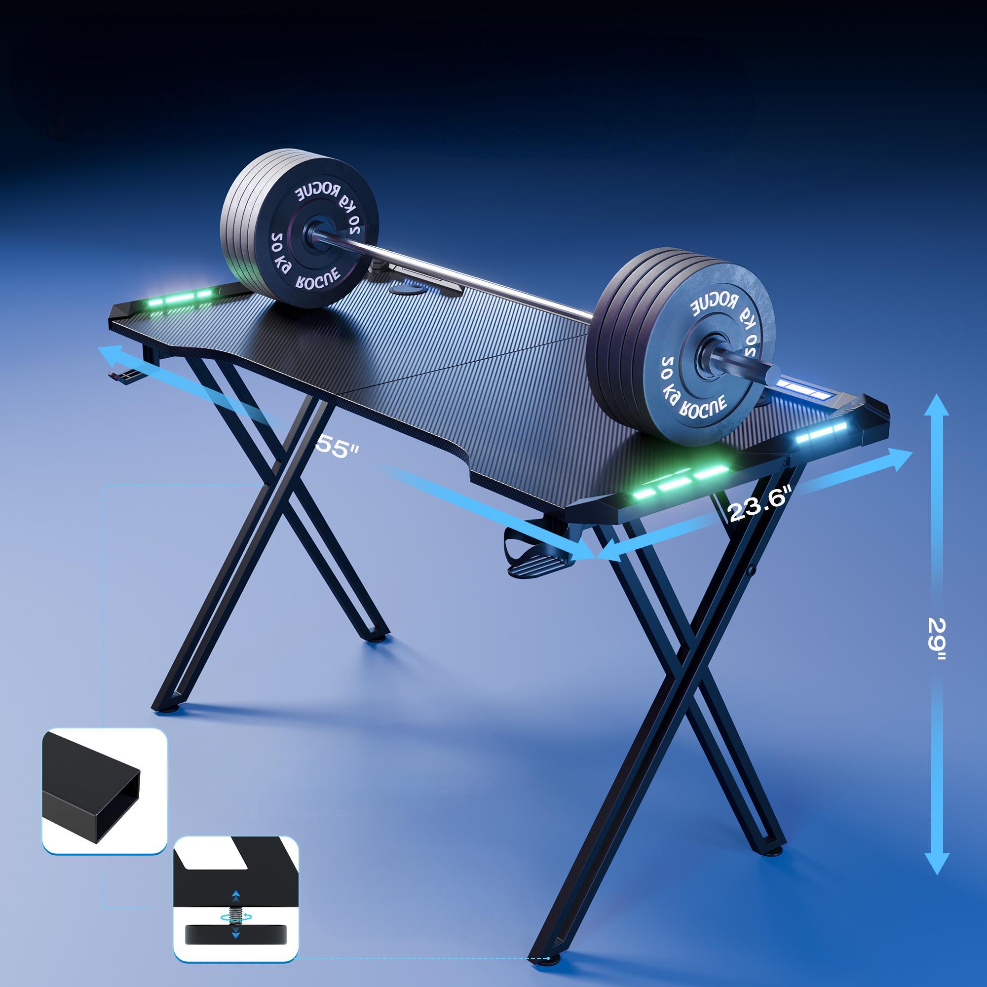 Scrivania da Gioco Nera Moderna con Gambe in X e Striscia LED RGB - Design Ergonomico, Superficie in Fibra di Carbonio Antigraffio, Altezza Regolabile (120/140/160cm) - Perfetta per Camera da Letto, Soggiorno & Sala Giochi, Postazione di Lavoro nel Soggio