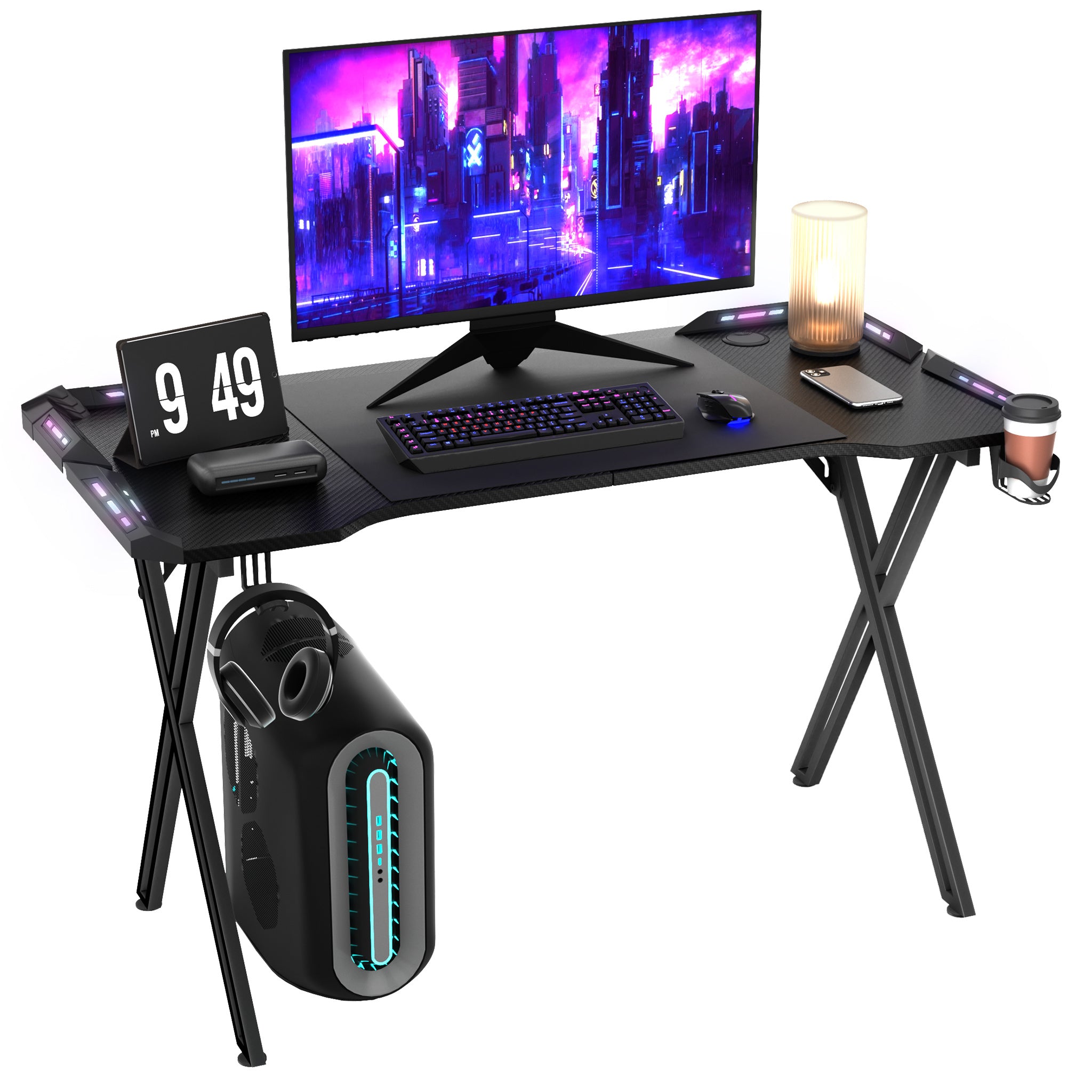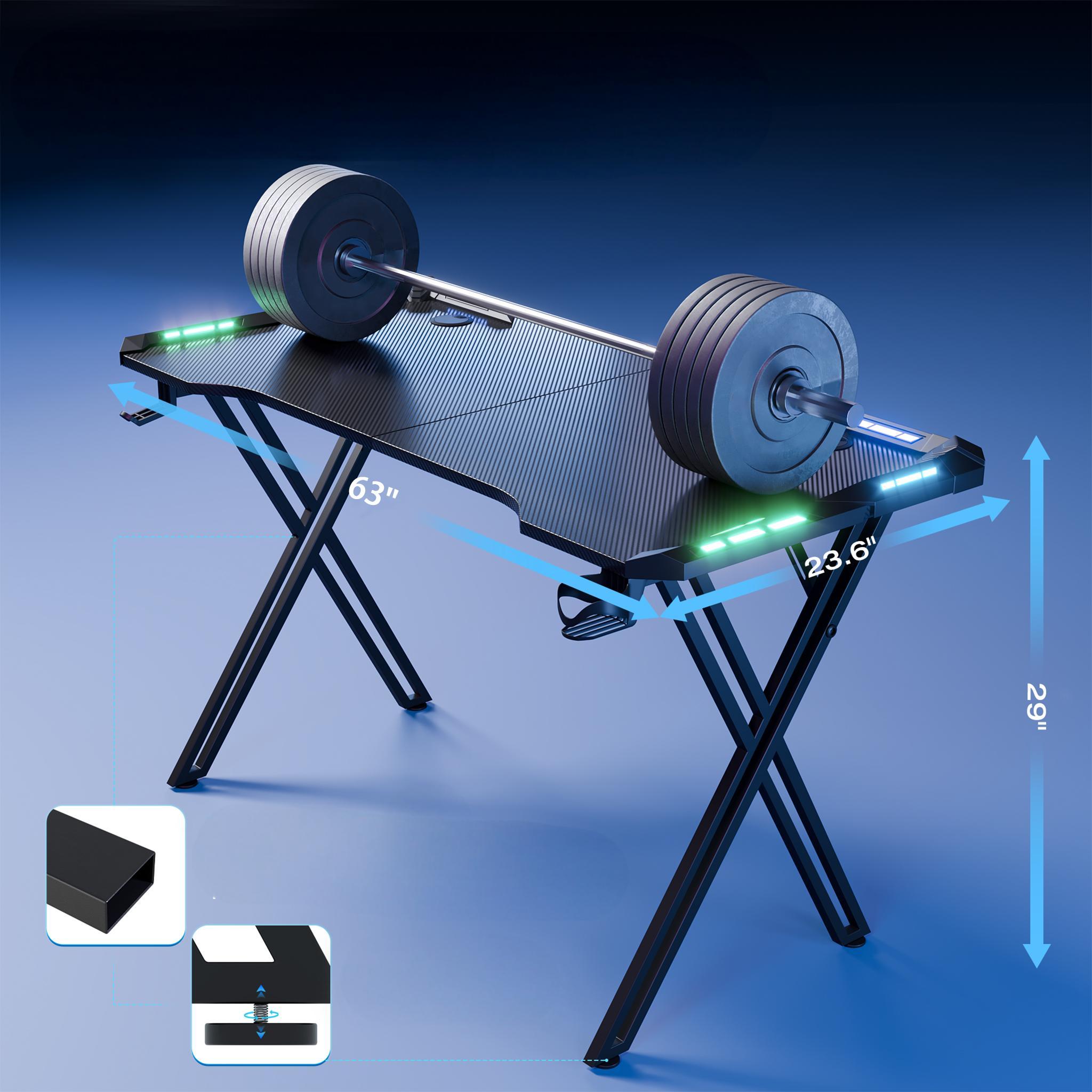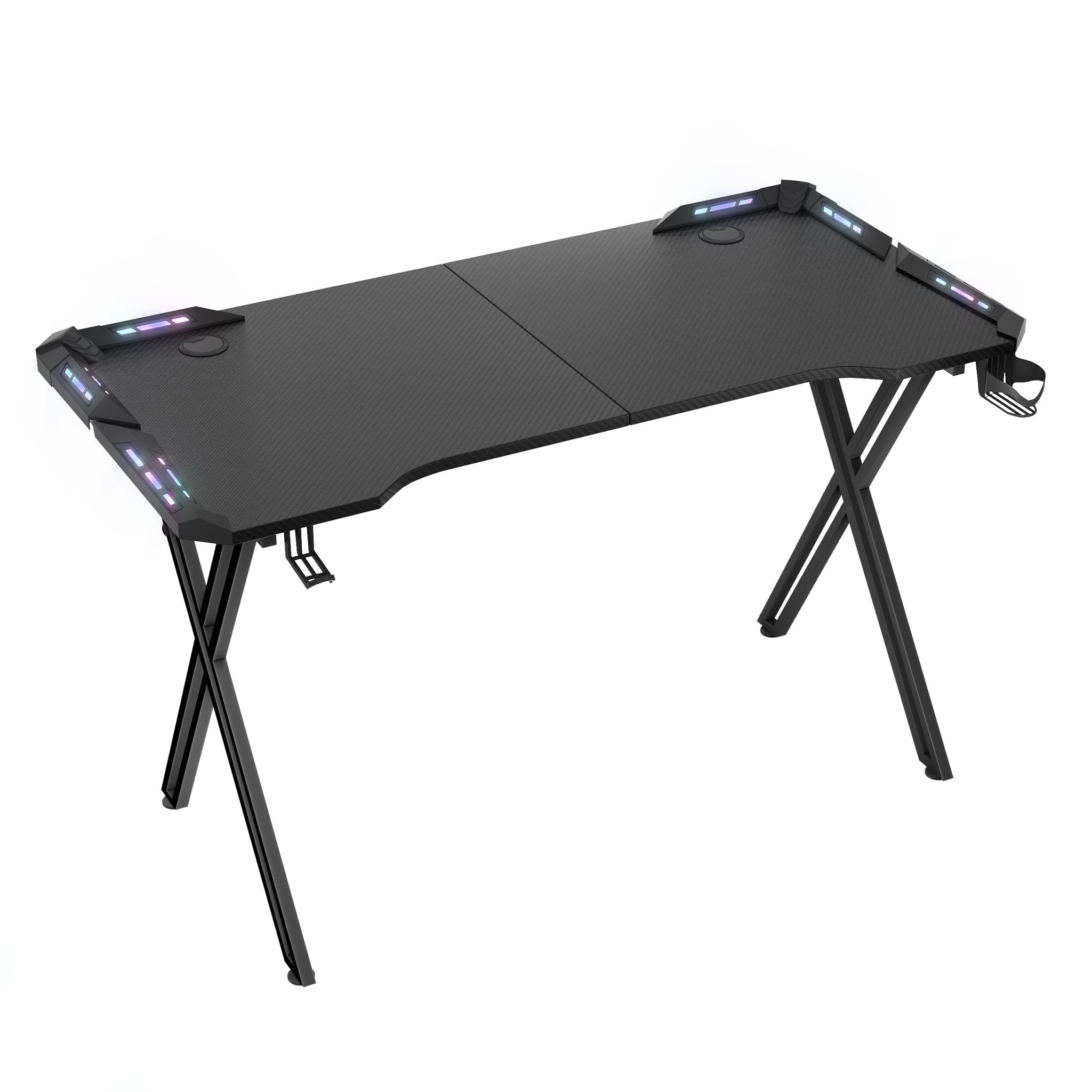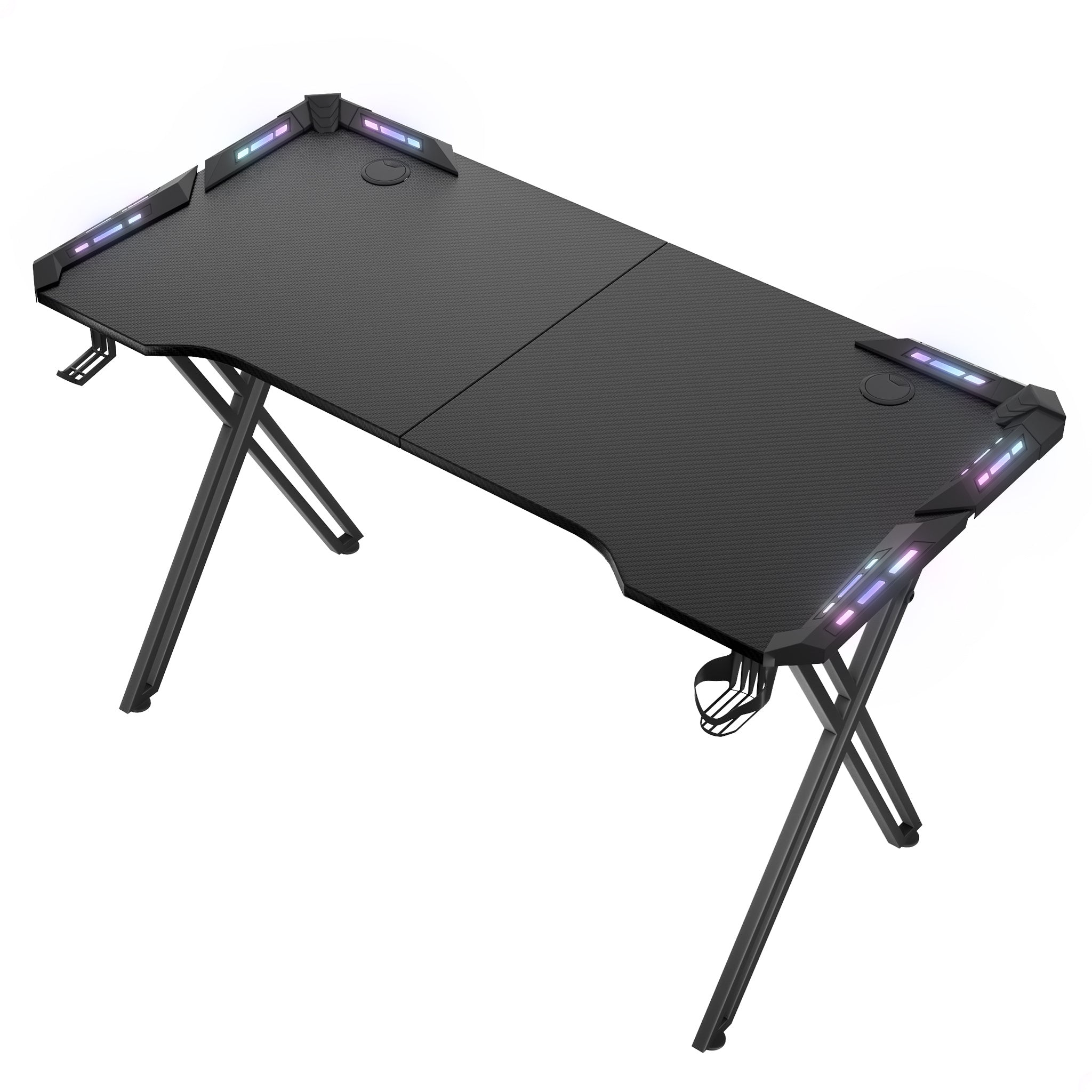 Scrivania da Gioco Nera Moderna con Gambe in X e Striscia LED RGB - Design Ergonomico, Superficie in Fibra di Carbonio Antigraffio, Altezza Regolabile (120/140/160cm) - Perfetta per Camera da Letto, Soggiorno & Sala Giochi, Postazione di Lavoro nel Soggio