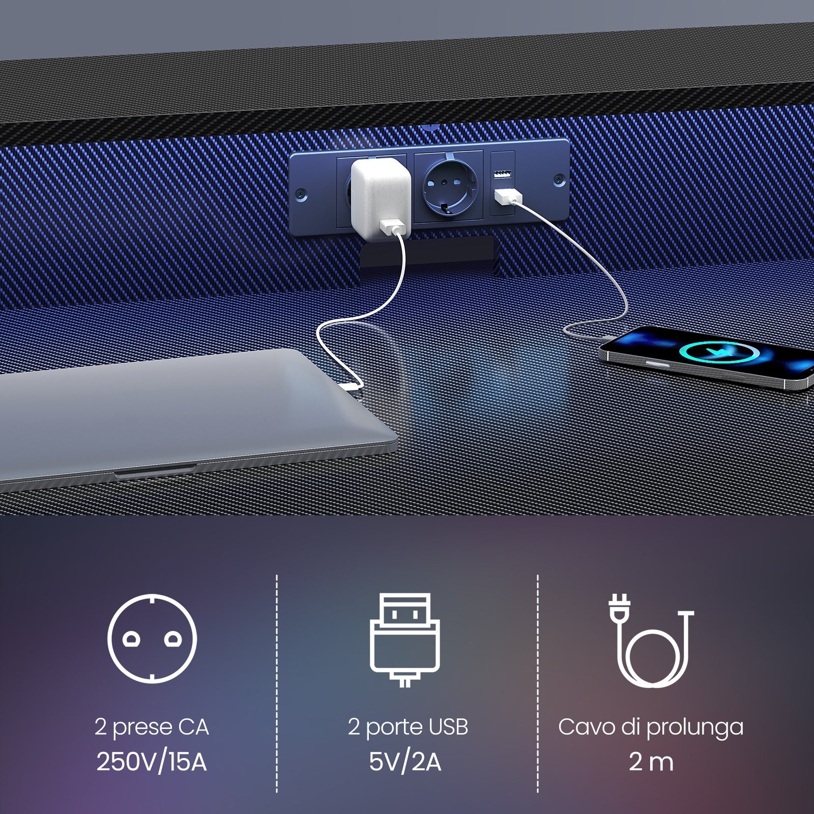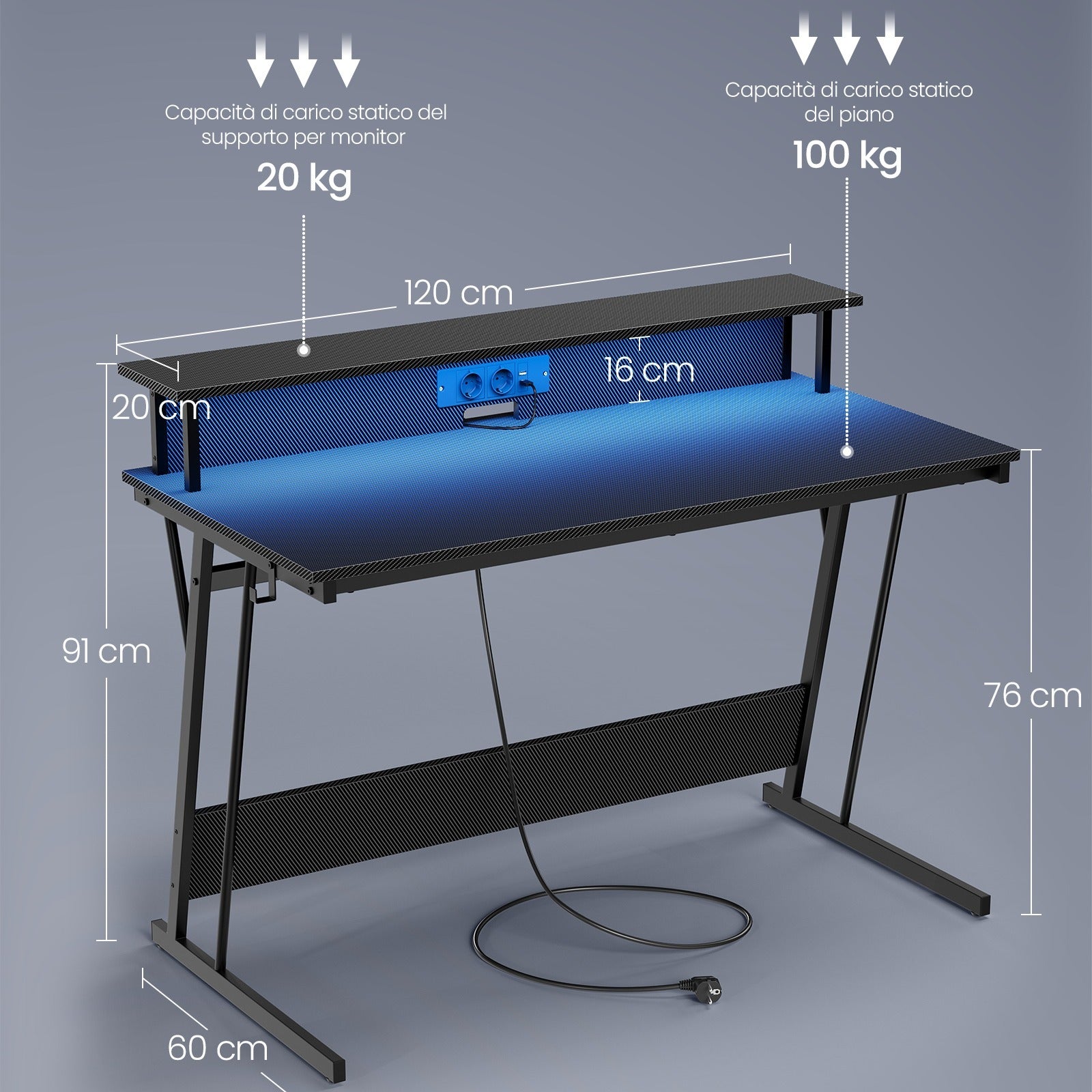 VASAGLE Scrivania Gaming LED 120x60cm Nero Carbone - Prese USB e Monitor