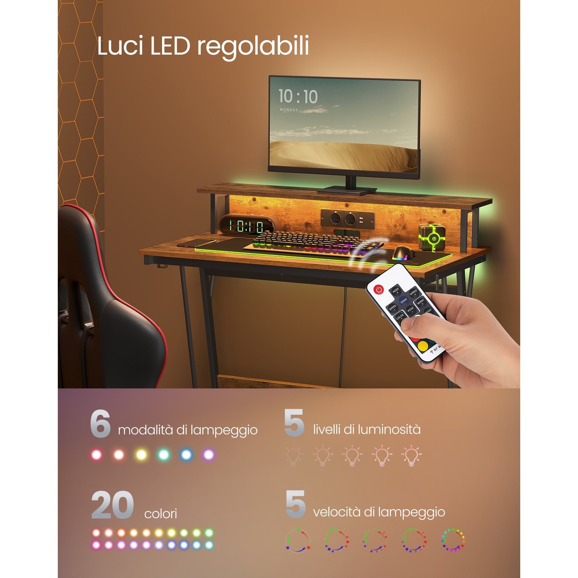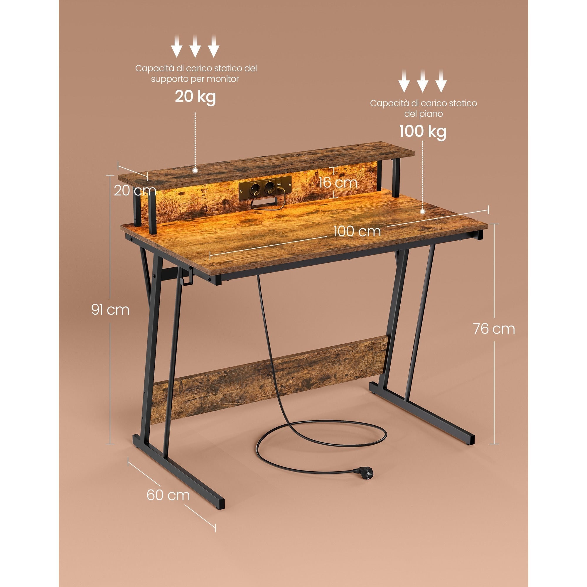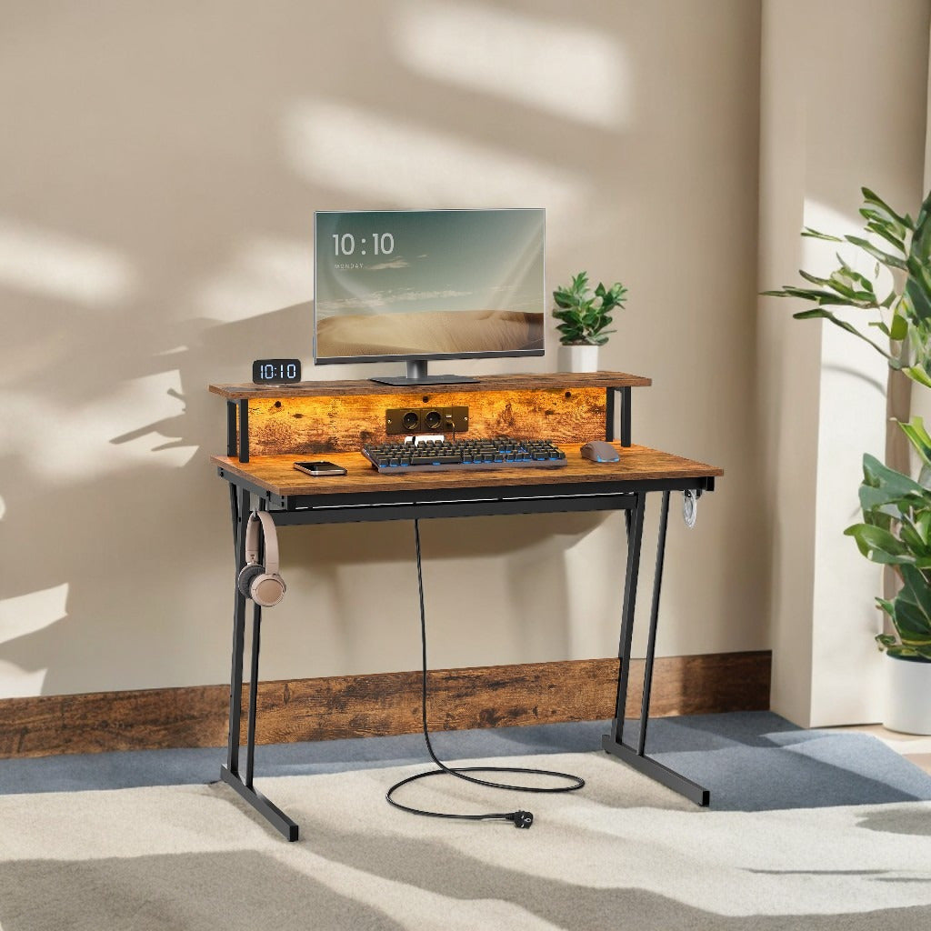 VASAGLE Scrivania Gaming LED 100x60cm Marrone Vintage - Prese USB e Monitor