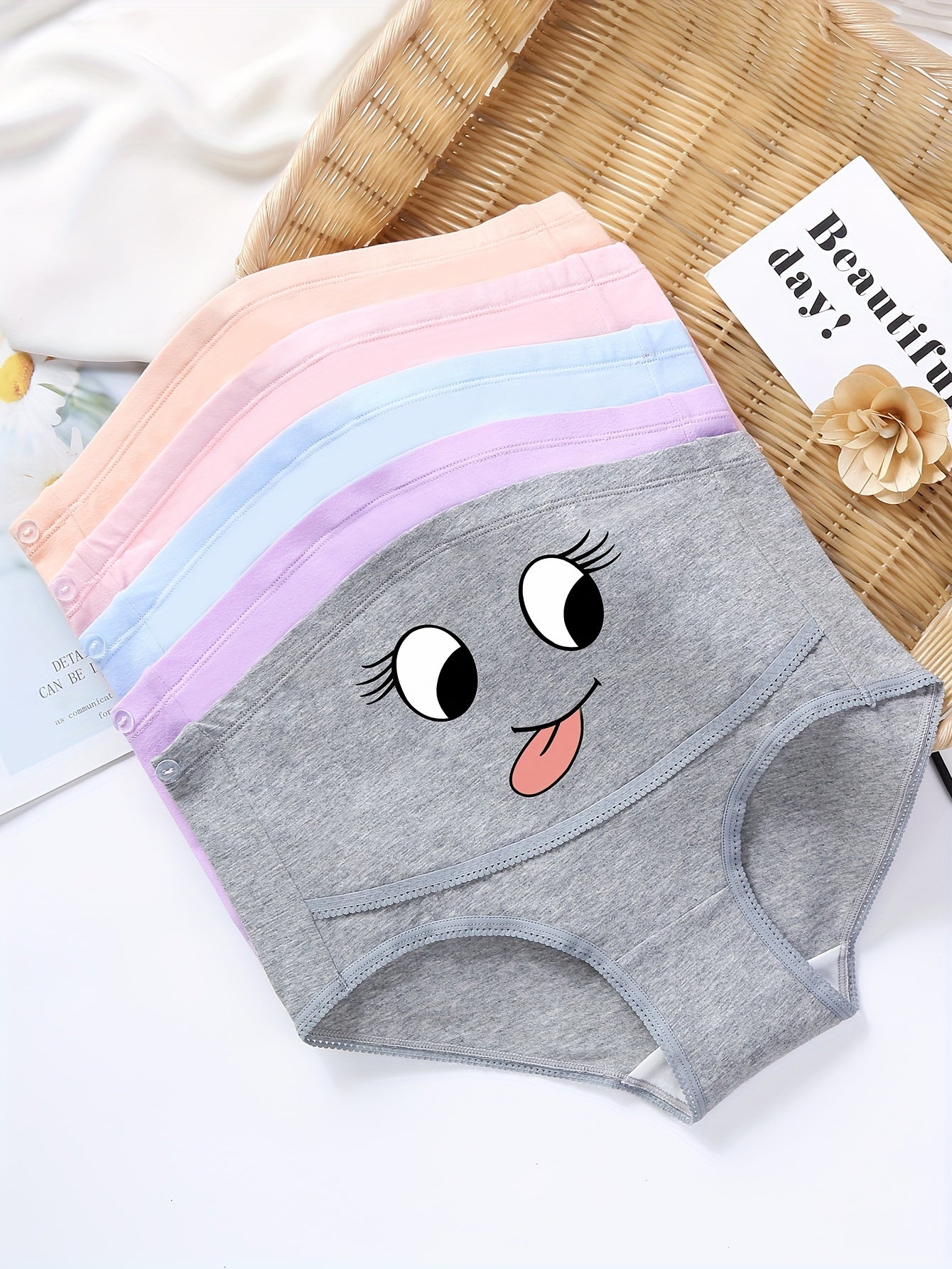 Set di 5 mutandine per maternità con stampa viso cartoon, slip a vita alta in cotone comodo e traspirante