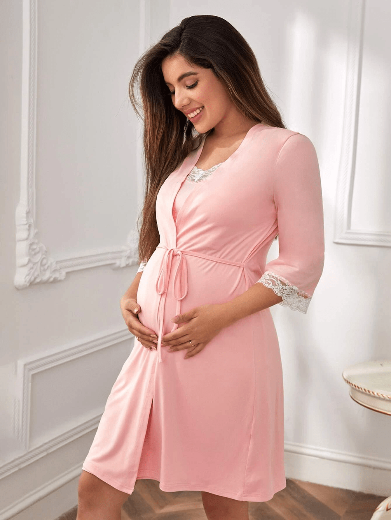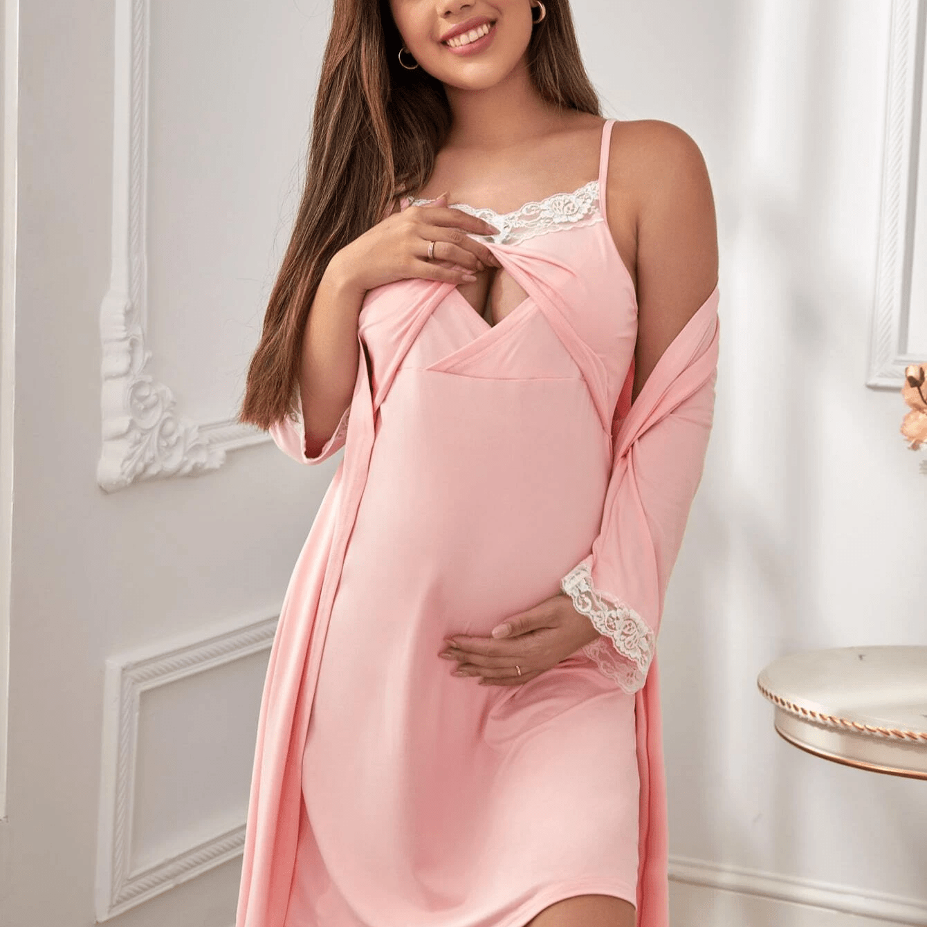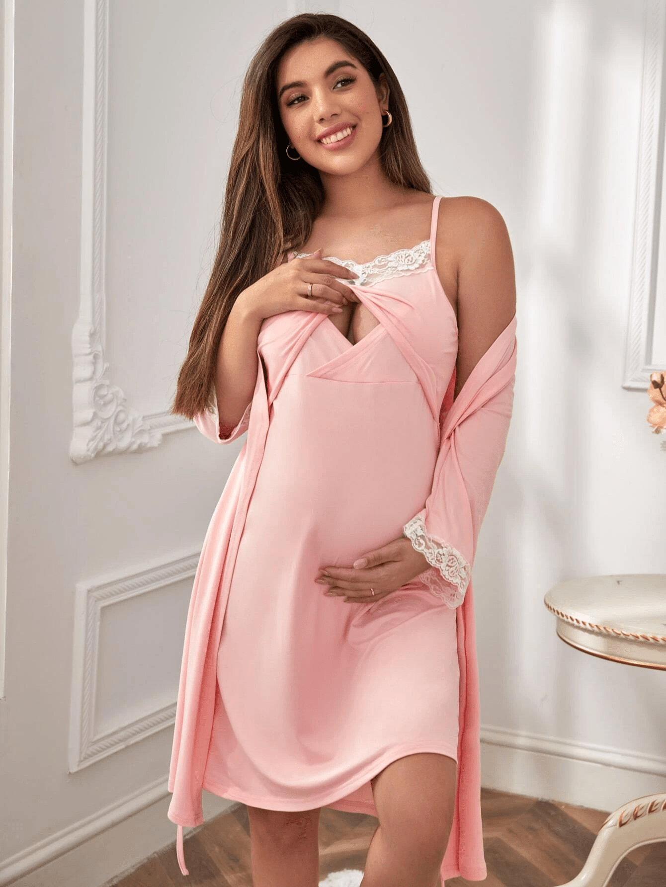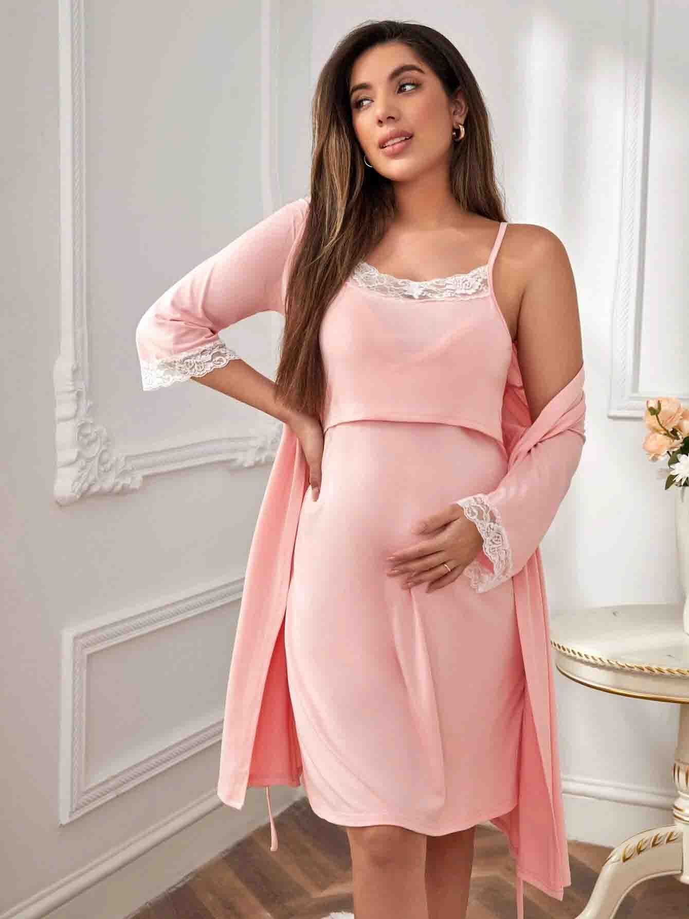 Set di camici da notte e cardigan in pizzo solido per l'allattamento al seno delle donne in gravidanza, 2 pezzi di abbigliamento da casa