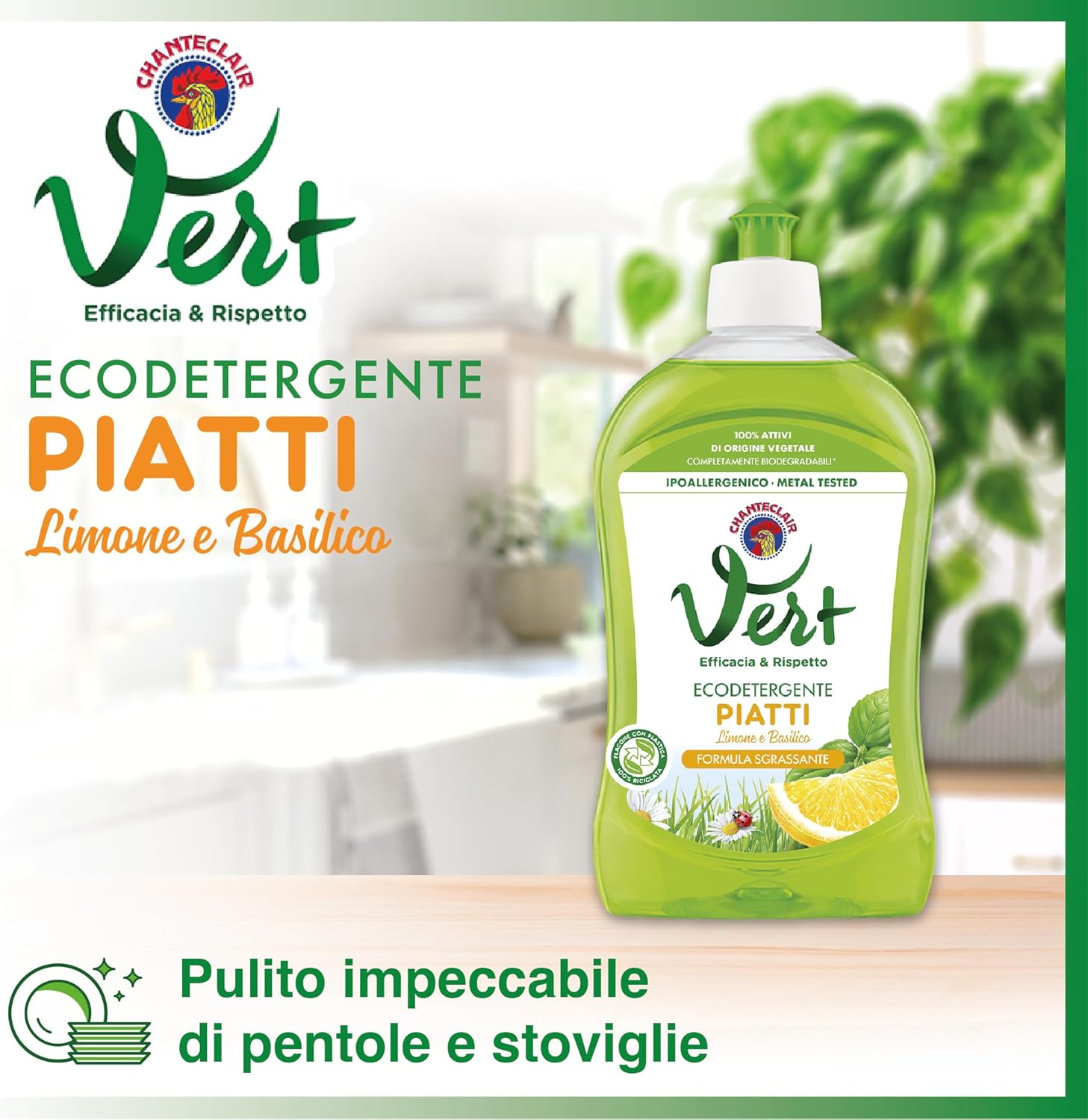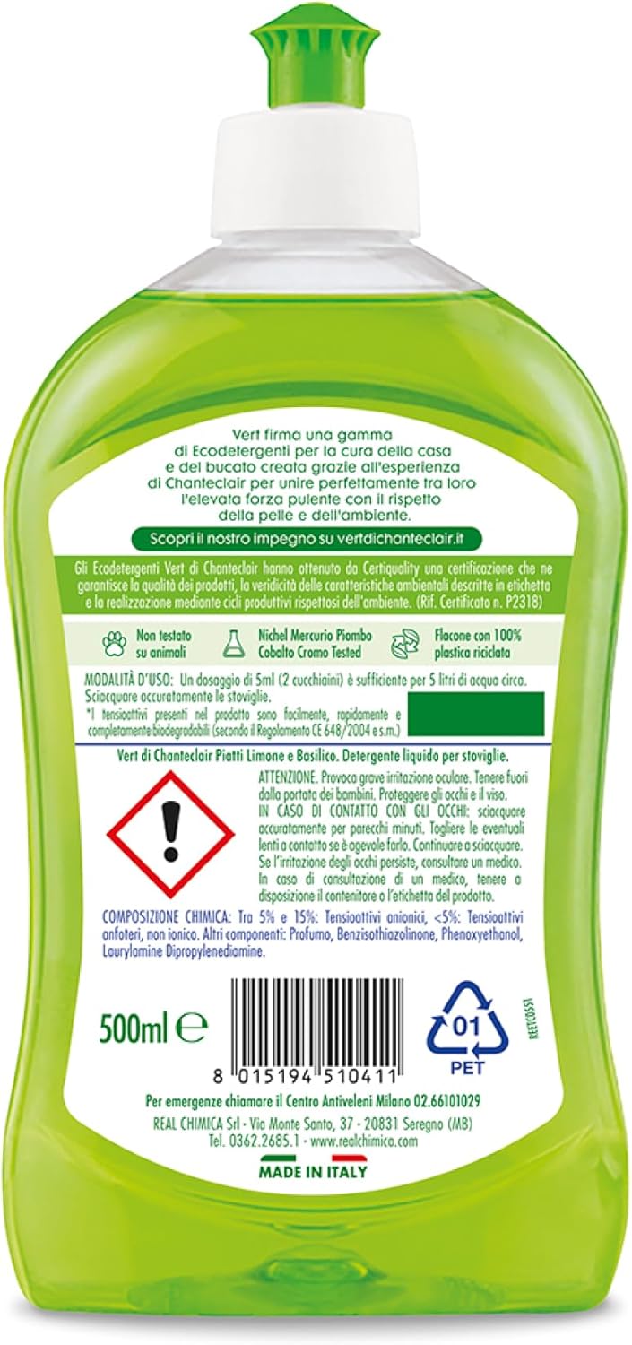 Vert di Chanteclair - Ecodetergente Piatti, Limone e Basilico - Ipoallergenico, Metal tested,100% Attivi di Origine Vegetale, Formula Sgrassante - 12 Flaconi da 500 ml