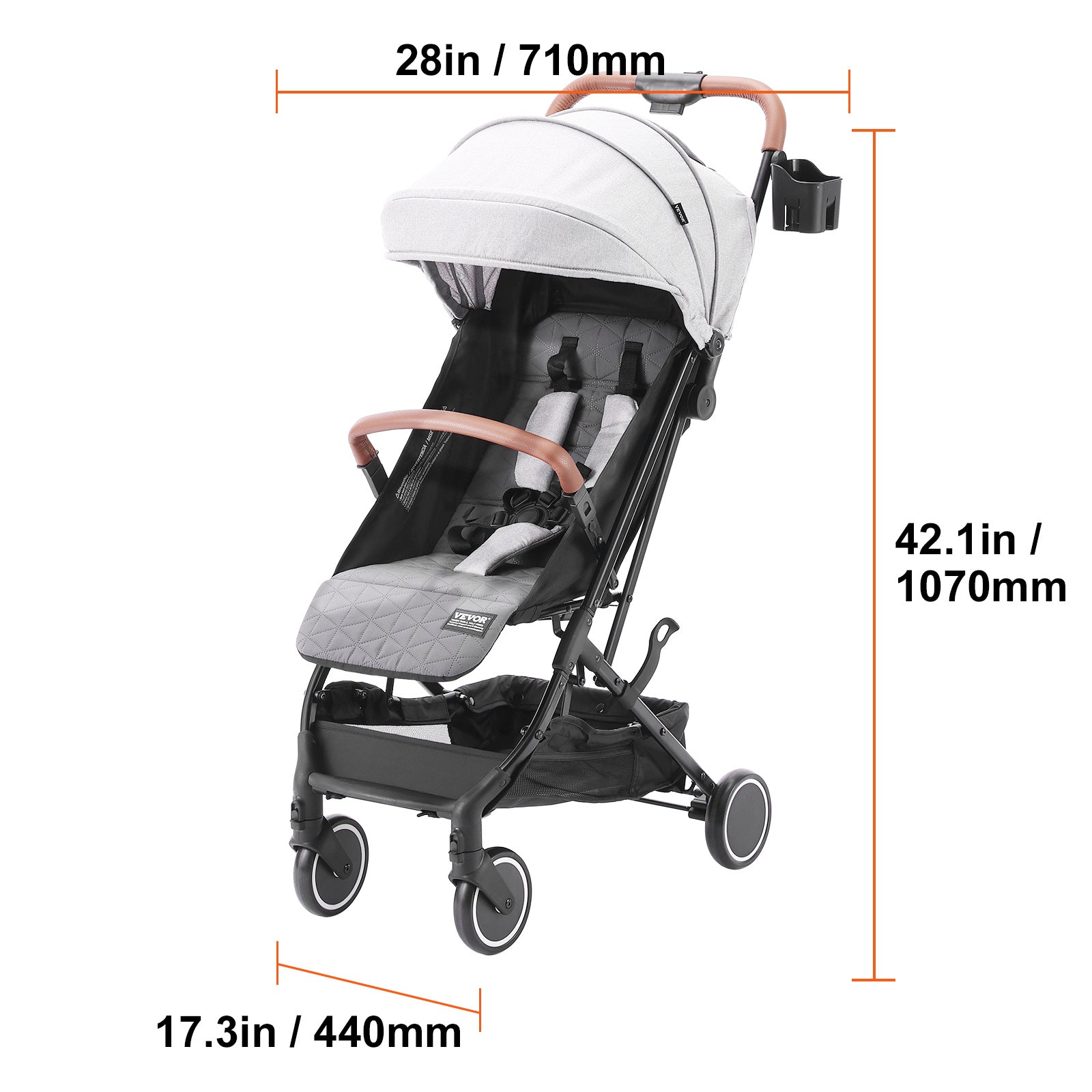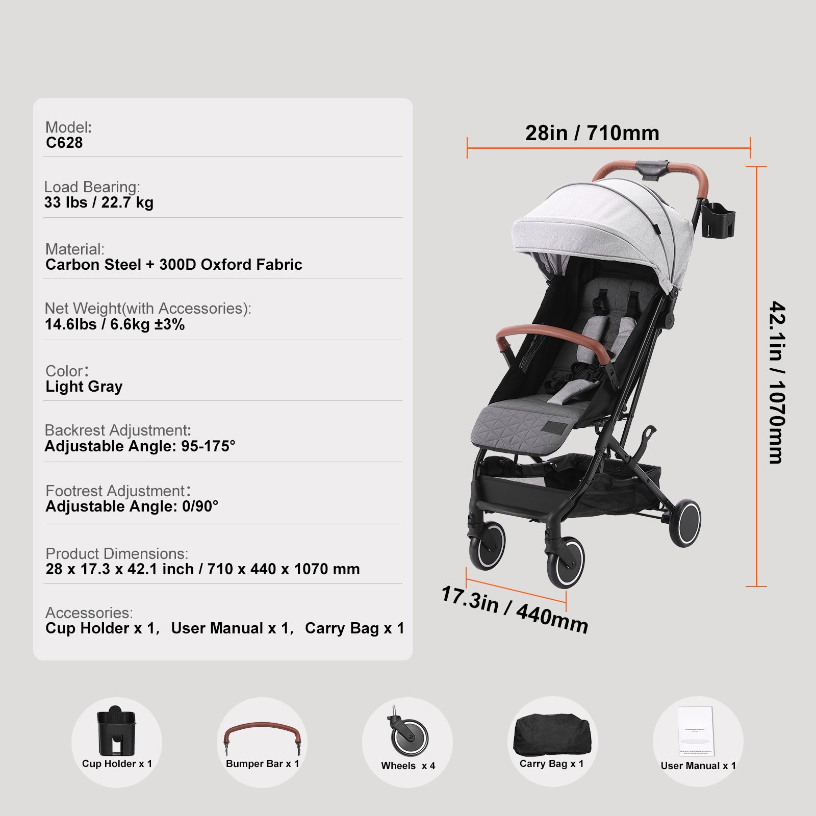 VEVOR Passeggino per Neonati, Passeggino per Bambini con Schienale Regolabile 95°-175° Poggiapiedi Regolabile 0/90°, Passeggino Neonato con Portabicchieri Borsa per il Trasporto, Grigio Chiaro