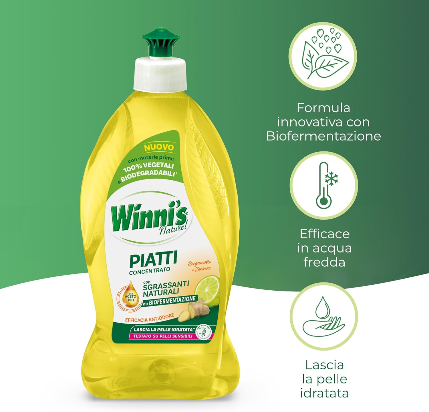 Winni's - Detersivo Piatti e Stoviglie a Mano, Bergamotto e Zenzero, Concentrato, Ipoallergenico, con Sgrassanti Naturali da Biofermentazione, Materie Prime di Origine Vegetale, 480 ml x 12 Confezioni