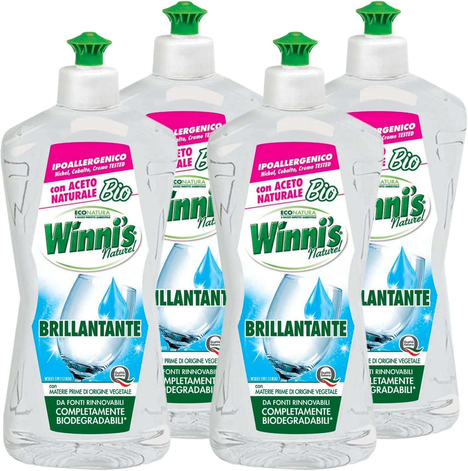 Winni's Naturel Brillantante per Lavastoviglie con Aceto Naturale Bio Ipoallergenico Materie Prime Origine Vegetale Completamente Biodegradabili - 4 Flaconi da 250ml